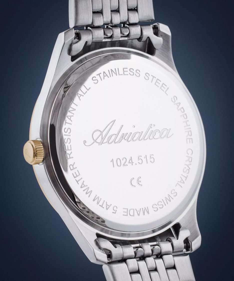 Часы Adriatica A1024.2111Q представляют собой идеальное сочетание элегантности и функциональности, разработанное для современных мужчин. Их стильный циферблат защищен сапфировым стекломСапфировое стеклоПрочный и надёжный материал из кристалла сапфира синтетического происхождения, характеризующийся особой твёрдостью и устойчивостью к царапинам и повреждениям., что придает дополнительную устойчивость к царапинам. Корпус из нержавеющей стали подчеркивает их изысканность и долговечность. Надежный кварцевый механизм с калибром RONDA 515 гарантирует точность времени, а водозащита WR 50 (5 ATM) обеспечивает защиту от воды в различных условиях. Браслет из нержавеющей стали с раскладной застёжкойРаскладная застёжкаТакой тип застёжки используется только на браслетах из металла. Она никогда не раскрывается полностью, происходит разделение на 2 и более частей. Раскладывающая застёжка снизит вероятность потери часов к минимуму., гармонично дополняет общий дизайн и обеспечивает комфортное ношение на запястье. Часы оснащены функцией отображения даты в окошке в положении 3 часа, что добавляет практичности в повседневной жизни. БезельБезельВнешний ободок, закрепляющий стекло. В спортивных часах так называется поворотное кольцо с делениями на циферблате, выполняет роль таймера – замеряет отрезки времени на шкале. Неподвижный безель – элемент декора. Однонаправленно вращающийся безель на дайверских часах позволяет фиксировать моменты погружения и выныривания на поверхность. с PVD-покрытиемPVDУльтратонкое покрытие наносится в технике вакуумного напыления, сочетает в себе нитрид титана особой прочности со слоем золота или оксида хрома. Несёт в себе декоративную или защитную функцию..