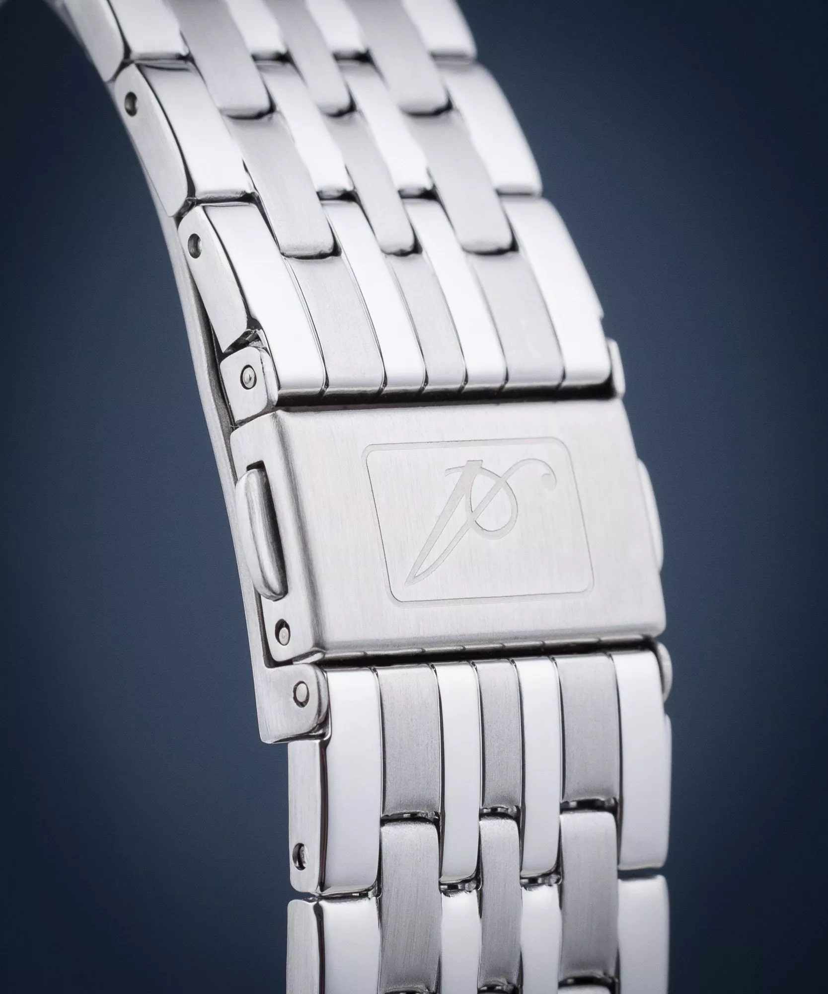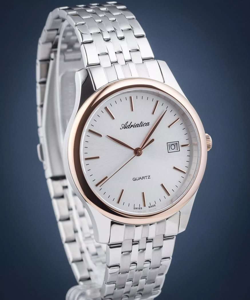 Часы Adriatica A1024.R113Q представляют собой идеальное сочетание элегантности и функциональности, разработанное для современных мужчин. Их стильный циферблат защищен сапфировым стекломСапфировое стеклоПрочный и надёжный материал из кристалла сапфира синтетического происхождения, характеризующийся особой твёрдостью и устойчивостью к царапинам и повреждениям., что придает дополнительную устойчивость к царапинам. Корпус из нержавеющей стали подчеркивает их изысканность и долговечность. Надежный кварцевый механизм с калибром RONDA 515 гарантирует точность времени, а водозащита WR 50 (5 ATM) обеспечивает защиту от воды в различных условиях. Браслет из нержавеющей стали с раскладной застёжкойРаскладная застёжкаТакой тип застёжки используется только на браслетах из металла. Она никогда не раскрывается полностью, происходит разделение на 2 и более частей. Раскладывающая застёжка снизит вероятность потери часов к минимуму., гармонично дополняет общий дизайн и обеспечивает комфортное ношение на запястье. Часы оснащены функцией отображения даты в окошке в положении 3 часа, что добавляет практичности в повседневной жизни. БезельБезельВнешний ободок, закрепляющий стекло. В спортивных часах так называется поворотное кольцо с делениями на циферблате, выполняет роль таймера – замеряет отрезки времени на шкале. Неподвижный безель – элемент декора. Однонаправленно вращающийся безель на дайверских часах позволяет фиксировать моменты погружения и выныривания на поверхность. с PVD-покрытиемPVDУльтратонкое покрытие наносится в технике вакуумного напыления, сочетает в себе нитрид титана особой прочности со слоем золота или оксида хрома. Несёт в себе декоративную или защитную функцию..