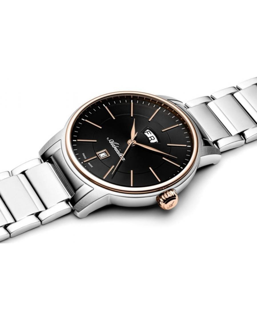 Часы Adriatica A1144.R114Q представляют собой идеальное сочетание элегантности и функциональности, разработанное для современных мужчин. Их стильный черный циферблат защищен сапфировым стекломСапфировое стеклоПрочный и надёжный материал из кристалла сапфира синтетического происхождения, характеризующийся особой твёрдостью и устойчивостью к царапинам и повреждениям., что придает дополнительную устойчивость к царапинам. Корпус из нержавеющей стали и безельБезельВнешний ободок, закрепляющий стекло. В спортивных часах так называется поворотное кольцо с делениями на циферблате, выполняет роль таймера – замеряет отрезки времени на шкале. Неподвижный безель – элемент декора. Однонаправленно вращающийся безель на дайверских часах позволяет фиксировать моменты погружения и выныривания на поверхность. с PVD-покрытиемPVDУльтратонкое покрытие наносится в технике вакуумного напыления, сочетает в себе нитрид титана особой прочности со слоем золота или оксида хрома. Несёт в себе декоративную или защитную функцию. подчеркивает их изысканность и долговечность. Надежный кварцевый механизм с калибром RONDA 515 гарантирует точность времени, а водозащита WR 50 (5 ATM) обеспечивает защиту от воды в различных условиях. Браслет из нержавеющей стали с раскладной застёжкойРаскладная застёжкаТакой тип застёжки используется только на браслетах из металла. Она никогда не раскрывается полностью, происходит разделение на 2 и более частей. Раскладывающая застёжка снизит вероятность потери часов к минимуму., гармонично дополняет общий дизайн и обеспечивает комфортное ношение на запястье. Окошко даты находится в положении 6 часов. День недели отображается в положении 12 часов.