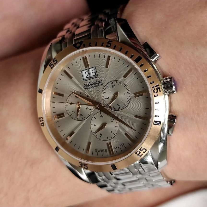 Мужские швейцарские часы-хронографХронографФункция позволяет измерять отрезки времени с особой точностью: часы, минуты, секунды. Верным признаком хронографа является наличие на циферблате 3 дополнительных окошек-счётчиков. с секундомеромСекундомерСекундоме́р — прибор, способный измерять интервалы времени с точностью до долей секунды. Adriatica Chronograph A8202.R117CH имеют кварцевый механизм с высокой точностью. Сапфировое стеклоСапфировое стеклоПрочный и надёжный материал из кристалла сапфира синтетического происхождения, характеризующийся особой твёрдостью и устойчивостью к царапинам и повреждениям. устойчивое к появлению царапин, обладающее высокой прозрачностью защищает гильошированный серый циферблат с метками в виде штрихов. Корпус часов изготовлен из нержавеющей стали, а на безельБезельВнешний ободок, закрепляющий стекло. В спортивных часах так называется поворотное кольцо с делениями на циферблате, выполняет роль таймера – замеряет отрезки времени на шкале. Неподвижный безель – элемент декора. Однонаправленно вращающийся безель на дайверских часах позволяет фиксировать моменты погружения и выныривания на поверхность. нанесено PVDPVDУльтратонкое покрытие наносится в технике вакуумного напыления, сочетает в себе нитрид титана особой прочности со слоем золота или оксида хрома. Несёт в себе декоративную или защитную функцию. покрытие. Часы имеют окошко даты находится в положении 12 часов, а также 3 дополнительных циферблата. Стальной браслет с раскладной застёжкойРаскладная застёжкаТакой тип застёжки используется только на браслетах из металла. Она никогда не раскрывается полностью, происходит разделение на 2 и более частей. Раскладывающая застёжка снизит вероятность потери часов к минимуму. обеспечивает комфортное ношение и надежную фиксацию на запястье. Надежный кварцевый механизм с калибром RONDA 5040 гарантирует точность времени, а водозащита 50 метров, что позволит защитить корпус от случайных брызг или капель дождя.