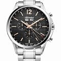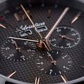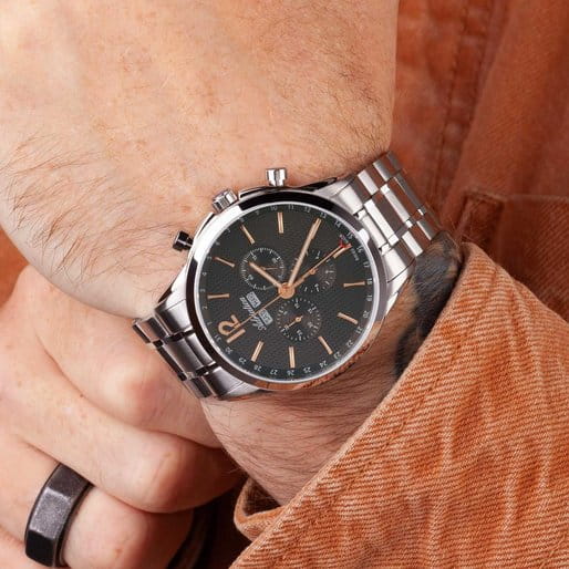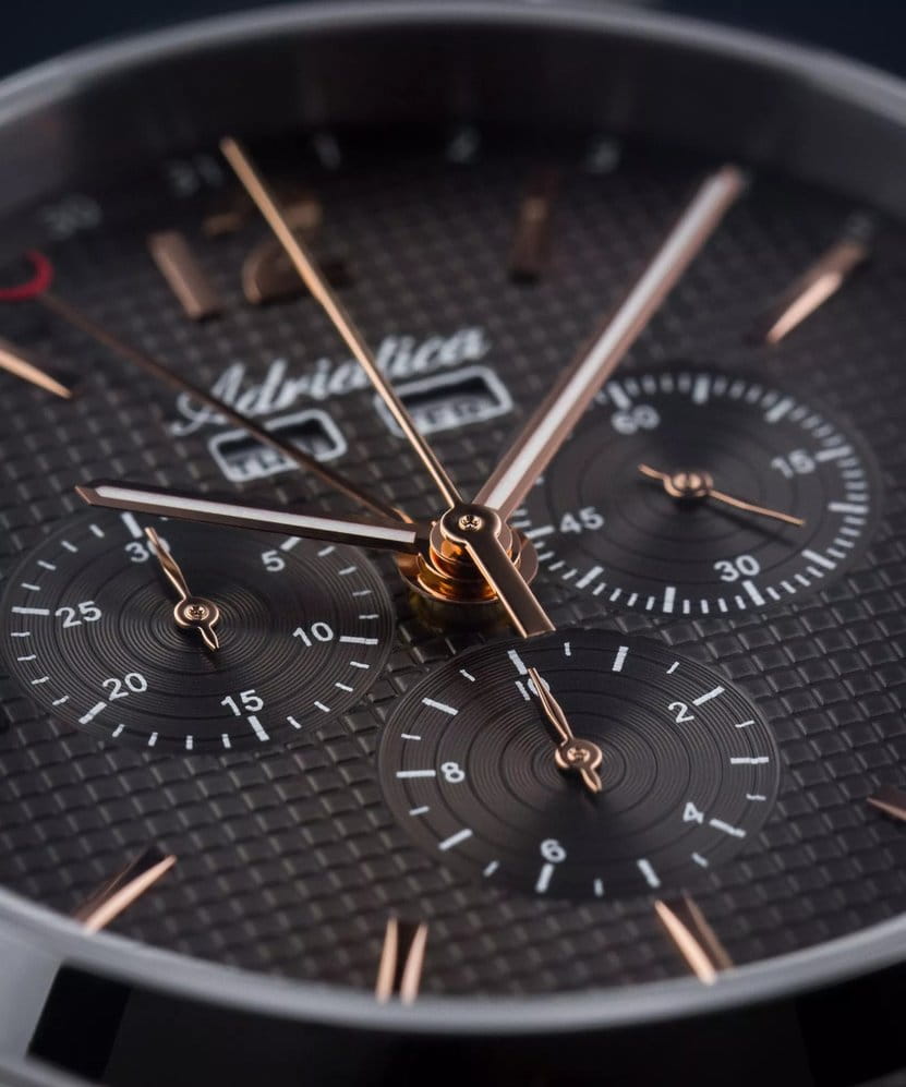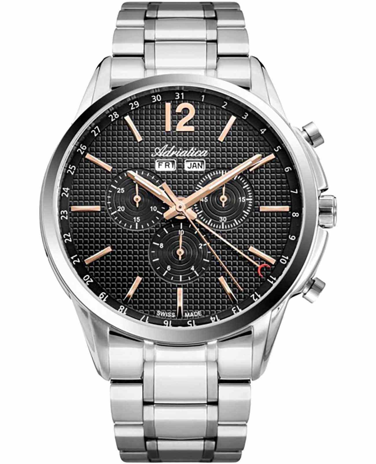 Мужские швейцарские часы-хронографХронографФункция позволяет измерять отрезки времени с особой точностью: часы, минуты, секунды. Верным признаком хронографа является наличие на циферблате 3 дополнительных окошек-счётчиков. с секундомеромСекундомерСекундоме́р — прибор, способный измерять интервалы времени с точностью до долей секунды. Adriatica Passion A8283.51R6CH имеют кварцевый механизм с высокой точностью. Сапфировое стеклоСапфировое стеклоПрочный и надёжный материал из кристалла сапфира синтетического происхождения, характеризующийся особой твёрдостью и устойчивостью к царапинам и повреждениям. устойчивое к появлению царапин, обладающее высокой прозрачностью защищает текстурированный черный циферблат с метками в виде штрихов и арабской цифры 12. Месяц и день недели отображаются в отдельных окошках, а дата отображается центральной стрелкой, также часы имеют 3 дополнительных циферблата. Корпус часов изготовлен из нержавеющей стали. На часовую, минутную стрелки нанесено люминесцентное покрытиеЛюминесцентное покрытиеПозволяет считывать показания времени в темноте. Производители наносят на стрелки, часовые индексы, безель или поверхность циферблата светонакопительный состав, дающий холодное свечение., которое светится в темноте, создавая необычное изображение. Стальной браслет с раскладной застёжкойРаскладная застёжкаТакой тип застёжки используется только на браслетах из металла. Она никогда не раскрывается полностью, происходит разделение на 2 и более частей. Раскладывающая застёжка снизит вероятность потери часов к минимуму. обеспечивает комфортное ношение и надежную фиксацию на запястье. Надежный кварцевый механизм с калибром RONDA 5040.F гарантирует точность времени, а водозащита 50 метров, позволит плавать, что позволит защитить корпус от случайных брызг или капель дождя.