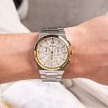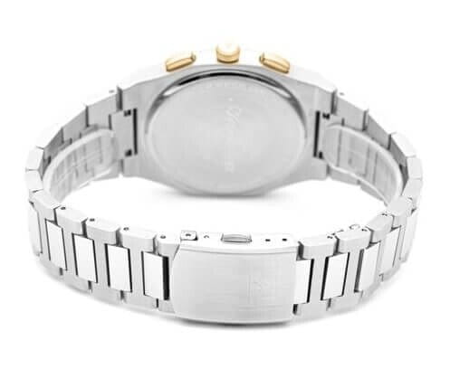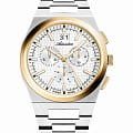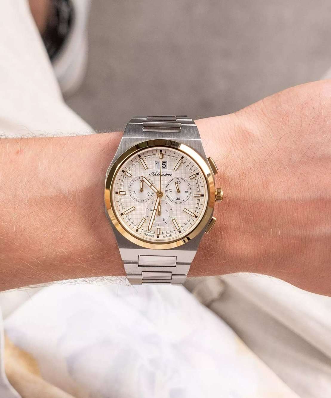 Мужские швейцарские часы-хронографХронографФункция позволяет измерять отрезки времени с особой точностью: часы, минуты, секунды. Верным признаком хронографа является наличие на циферблате 3 дополнительных окошек-счётчиков. с секундомеромСекундомерСекундоме́р — прибор, способный измерять интервалы времени с точностью до долей секунды.  Adriatica Premiere A8326.2113CH воплощают в себе элегантность и функциональность, идеально подходящие для современных мужчин, ценящих швейцарское качество. Их белый циферблат защищенный сапфировым стекломСапфировое стеклоПрочный и надёжный материал из кристалла сапфира синтетического происхождения, характеризующийся особой твёрдостью и устойчивостью к царапинам и повреждениям., заключен в корпус из нержавеющей стали диаметром 40 мм и толщиной 10 мм, а на безельБезельВнешний ободок, закрепляющий стекло. В спортивных часах так называется поворотное кольцо с делениями на циферблате, выполняет роль таймера – замеряет отрезки времени на шкале. Неподвижный безель – элемент декора. Однонаправленно вращающийся безель на дайверских часах позволяет фиксировать моменты погружения и выныривания на поверхность. нанесено PVDPVDУльтратонкое покрытие наносится в технике вакуумного напыления, сочетает в себе нитрид титана особой прочности со слоем золота или оксида хрома. Несёт в себе декоративную или защитную функцию. покрытие. Надежный кварцевый механизм с калибром Ronda 5040.B обеспечивает высокую точность, а водозащита 5 ATM делает часы устойчивыми к воздействию воды. Стальной браслет с раскладной застёжкойРаскладная застёжкаТакой тип застёжки используется только на браслетах из металла. Она никогда не раскрывается полностью, происходит разделение на 2 и более частей. Раскладывающая застёжка снизит вероятность потери часов к минимуму. обеспечивает комфортное и надежное ношение. Фактурный циферблат с метками в виде штрихов дополнен рисунком в клетку, а окошко даты находится в положении 12 часов, что добавляет практичности в повседневной жизни. Люминесцентное покрытиеЛюминесцентное покрытиеПозволяет считывать показания времени в темноте. Производители наносят на стрелки, часовые индексы, безель или поверхность циферблата светонакопительный состав, дающий холодное свечение. на стрелках и метках обеспечивает отличную видимость в темноте.