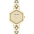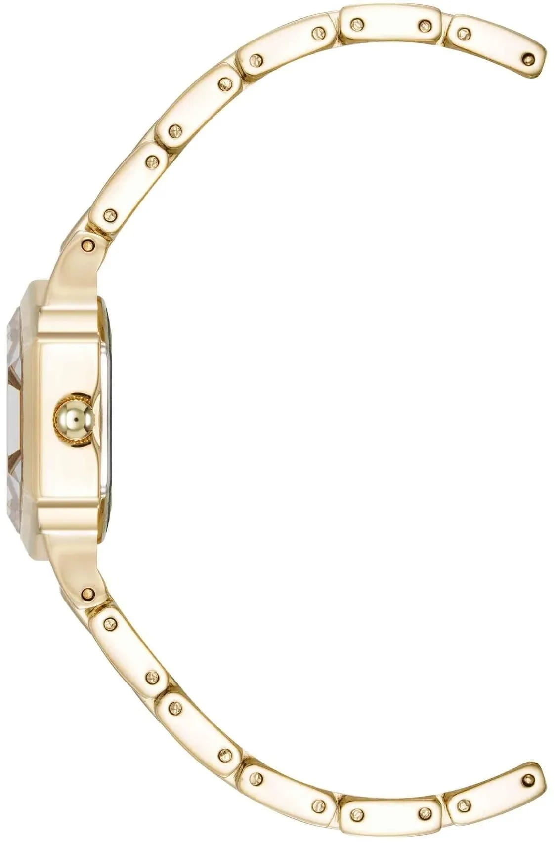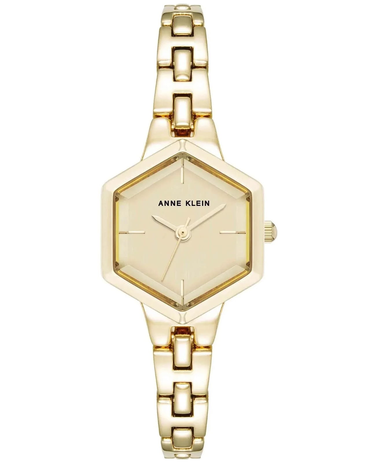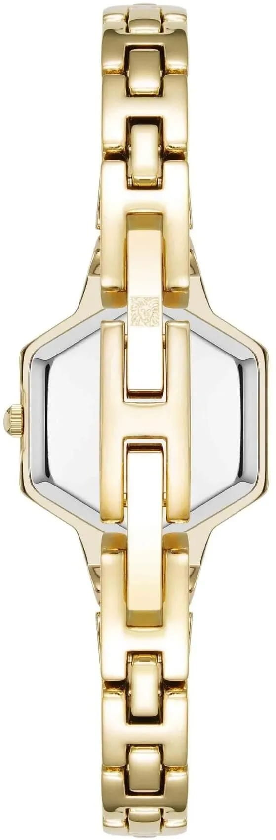 Женские кварцевые часы Anne Klein 5106CHGB представляют собой элегантный аксессуар с круглым корпусом диаметром 21 мм из латуни с PVDPVDУльтратонкое покрытие наносится в технике вакуумного напыления, сочетает в себе нитрид титана особой прочности со слоем золота или оксида хрома. Несёт в себе декоративную или защитную функцию.-покрытием в золотистом оттенке. Модель оснащена кварцевым механизмом японского производства с точностью хода ±20 секунд в месяц и аналоговой индикацией времени. Циферблат золотистого цвета с позолоченными стрелками защищен минеральным стекломМинеральное стеклоМинеральное стекло представляет собой искусственно выращенный минерал кварца. Такое стекло отличается особой устойчивостью к повреждениям и царапинам. Уступает по некоторым качествам сапфировому стеклу., устойчивым к царапинам. Водонепроницаемость 30 метров (3 атм) обеспечивает защиту от брызг и дождя. Металлический браслет из нержавеющей стали шириной 21 мм гармонично сочетается с корпусом, создавая целостный образ. Часы толщиной 6 мм отличаются утонченным профилем и комфортной посадкой на запястье.