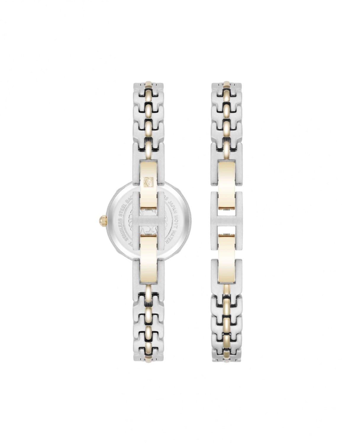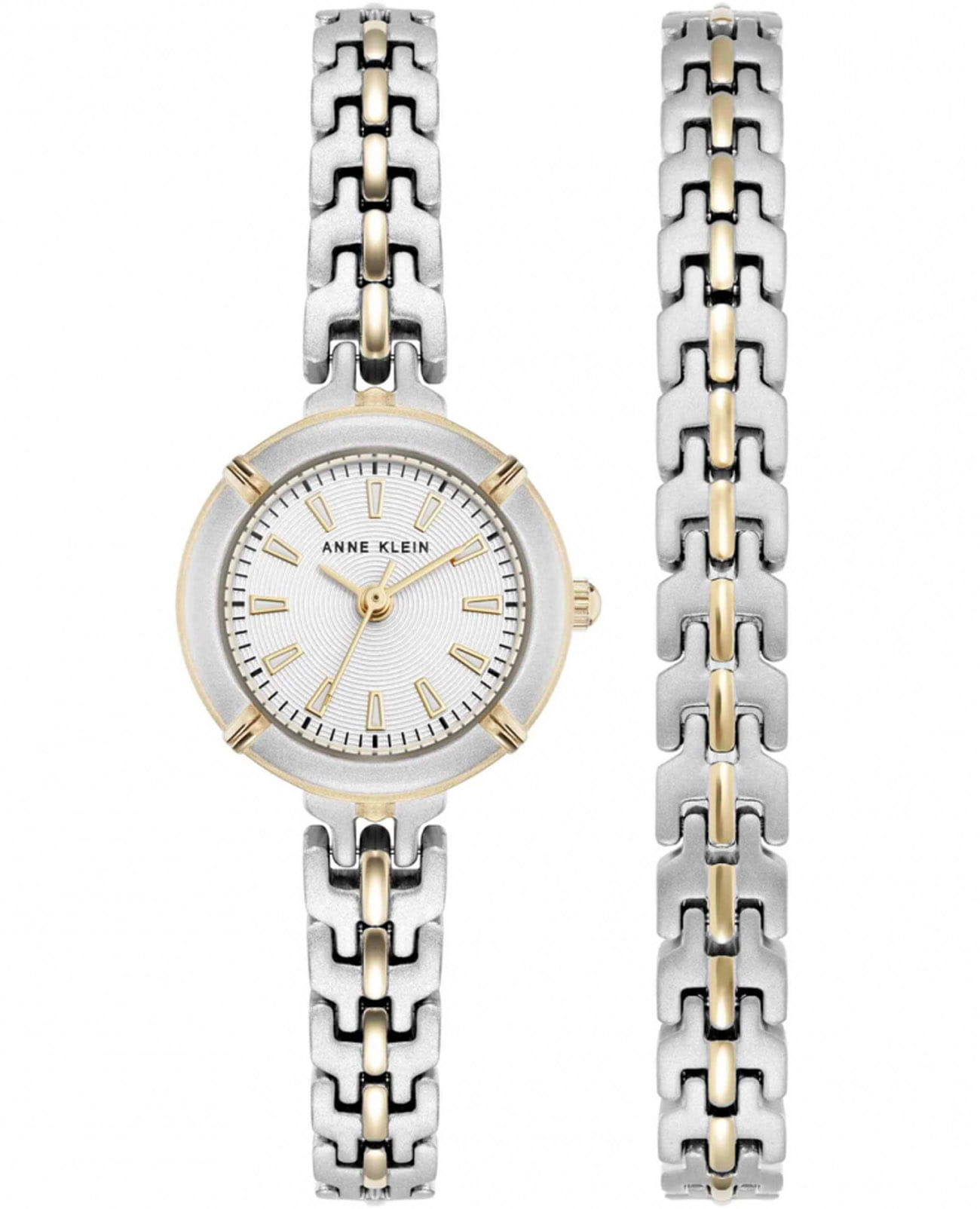 Женские кварцевые часы Anne Klein Box Set 5231TTST представляют собой элегантный аксессуар с круглым корпусом 22 мм из стали с частичным IP-покрытиемIP-покрытиеМетод ионного напыления. Демонстрирует повышенную устойчивость к истиранию, окислению и химическим веществам. Под воздействием высокого давления и температуры около 1500°C молекулы металла надёжно соединяются с частицами корпуса часов. цвета желтого золота. Модель оснащена кварцевым механизмом с точностью хода ±20 секунд в месяц. Циферблат с позолоченными стрелками защищен минеральным стекломМинеральное стеклоМинеральное стекло представляет собой искусственно выращенный минерал кварца. Такое стекло отличается особой устойчивостью к повреждениям и царапинам. Уступает по некоторым качествам сапфировому стеклу., устойчивым к царапинам. Водонепроницаемость 30 метров (3 атм) обеспечивает защиту от брызг и дождя. Изысканный браслет из нержавеющей стали с частичным IP-покрытиемIP-покрытиеМетод ионного напыления. Демонстрирует повышенную устойчивость к истиранию, окислению и химическим веществам. Под воздействием высокого давления и температуры около 1500°C молекулы металла надёжно соединяются с частицами корпуса часов. и с ювелирной застежкой гармонично сочетается с корпусом, создавая целостный образ. Часы отличаются утонченным профилем и комфортной посадкой на запястье. Прилагается дополнительный браслет.