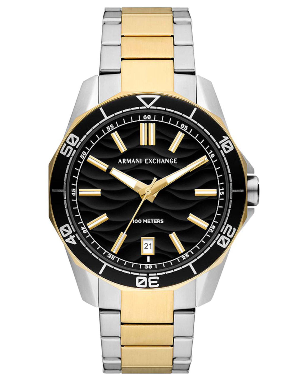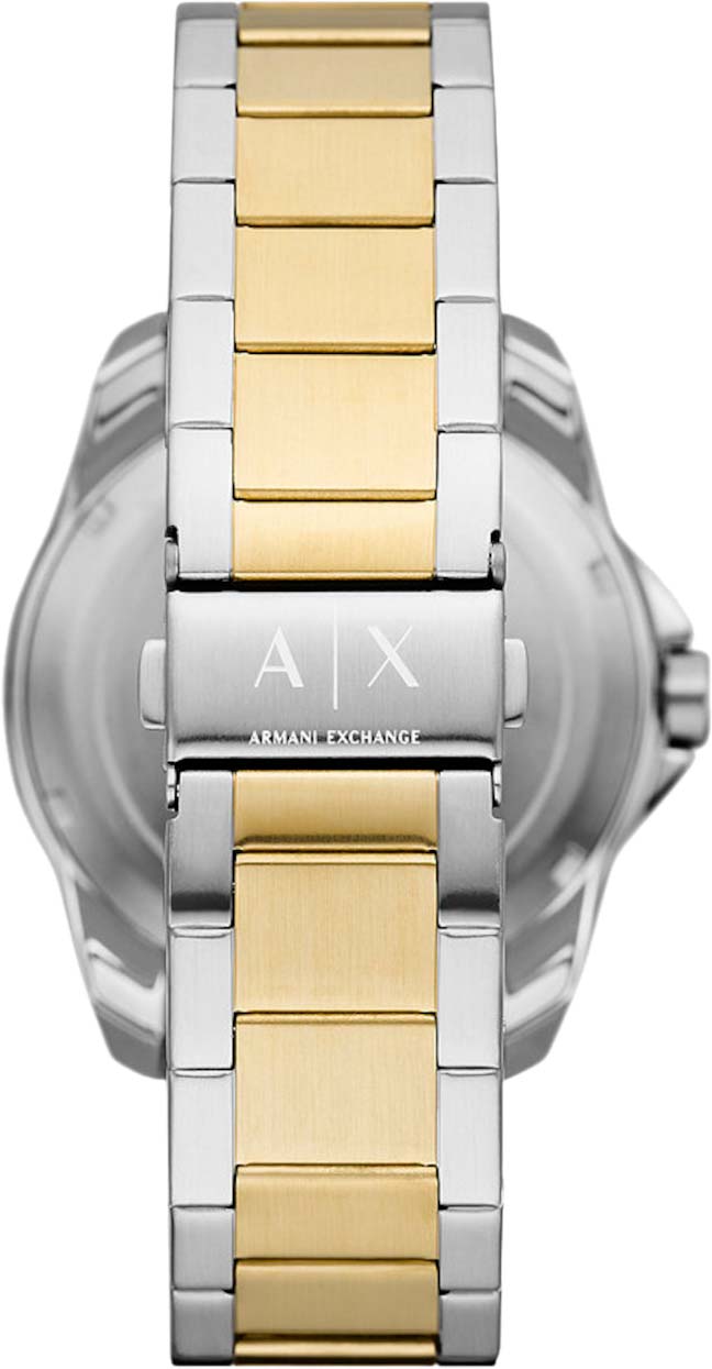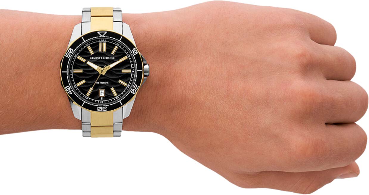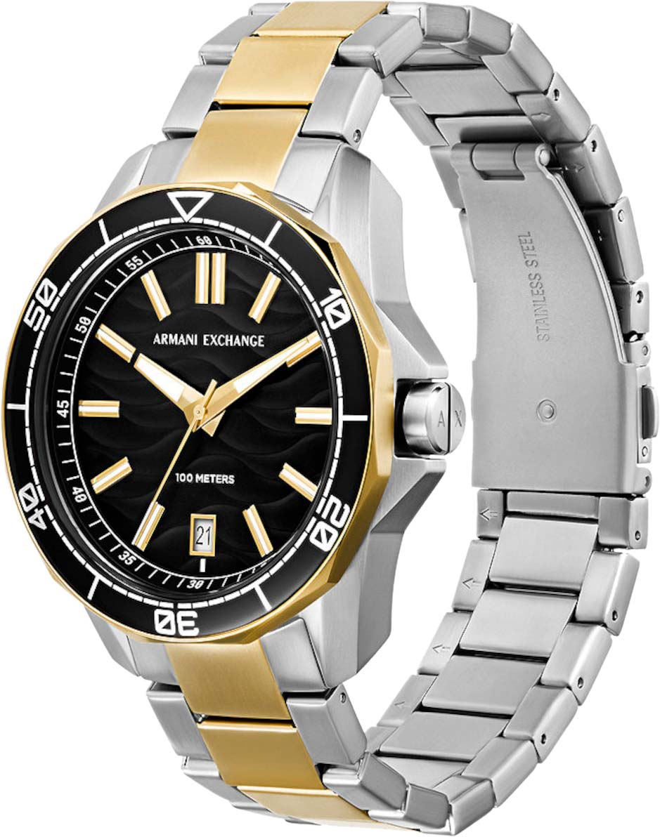Мужские наручные часы с минеральным стекломМинеральное стеклоМинеральное стекло представляет собой искусственно выращенный минерал кварца. Такое стекло отличается особой устойчивостью к повреждениям и царапинам. Уступает по некоторым качествам сапфировому стеклу. Armani Exchange Dante AX1956, кварцевый механизм с высокой точностью. Класс водозащиты: 100 метров, позволит плавать, нырять и заниматься другими водными видами спорта. Корпус часов изготовлен из стали с частичным IP-покрытиемIP-покрытиеМетод ионного напыления. Демонстрирует повышенную устойчивость к истиранию, окислению и химическим веществам. Под воздействием высокого давления и температуры около 1500°C молекулы металла надёжно соединяются с частицами корпуса часов.. Стальной браслет с частичным IP-покрытиемIP-покрытиеМетод ионного напыления. Демонстрирует повышенную устойчивость к истиранию, окислению и химическим веществам. Под воздействием высокого давления и температуры около 1500°C молекулы металла надёжно соединяются с частицами корпуса часов. на раскладной застёжкеРаскладная застёжкаТакой тип застёжки используется только на браслетах из металла. Она никогда не раскрывается полностью, происходит разделение на 2 и более частей. Раскладывающая застёжка снизит вероятность потери часов к минимуму.. Вращающийся  безельБезельВнешний ободок, закрепляющий стекло. В спортивных часах так называется поворотное кольцо с делениями на циферблате, выполняет роль таймера – замеряет отрезки времени на шкале. Неподвижный безель – элемент декора. Однонаправленно вращающийся безель на дайверских часах позволяет фиксировать моменты погружения и выныривания на поверхность. с IP-покрытиемIP-покрытиеМетод ионного напыления. Демонстрирует повышенную устойчивость к истиранию, окислению и химическим веществам. Под воздействием высокого давления и температуры около 1500°C молекулы металла надёжно соединяются с частицами корпуса часов.. Текстурированный циферблат с метками в виде штрихов. Окошко даты находится в положении 6 часов.