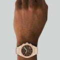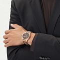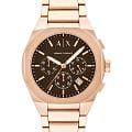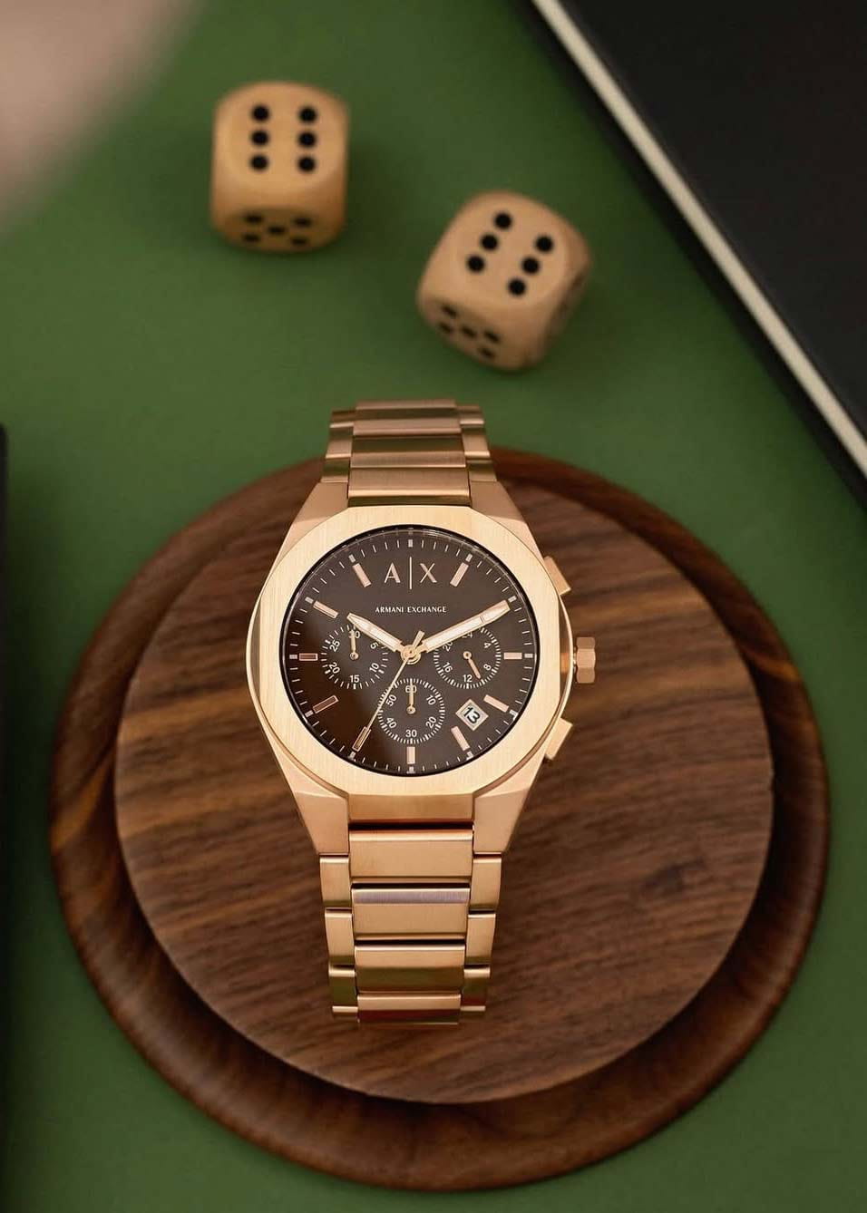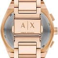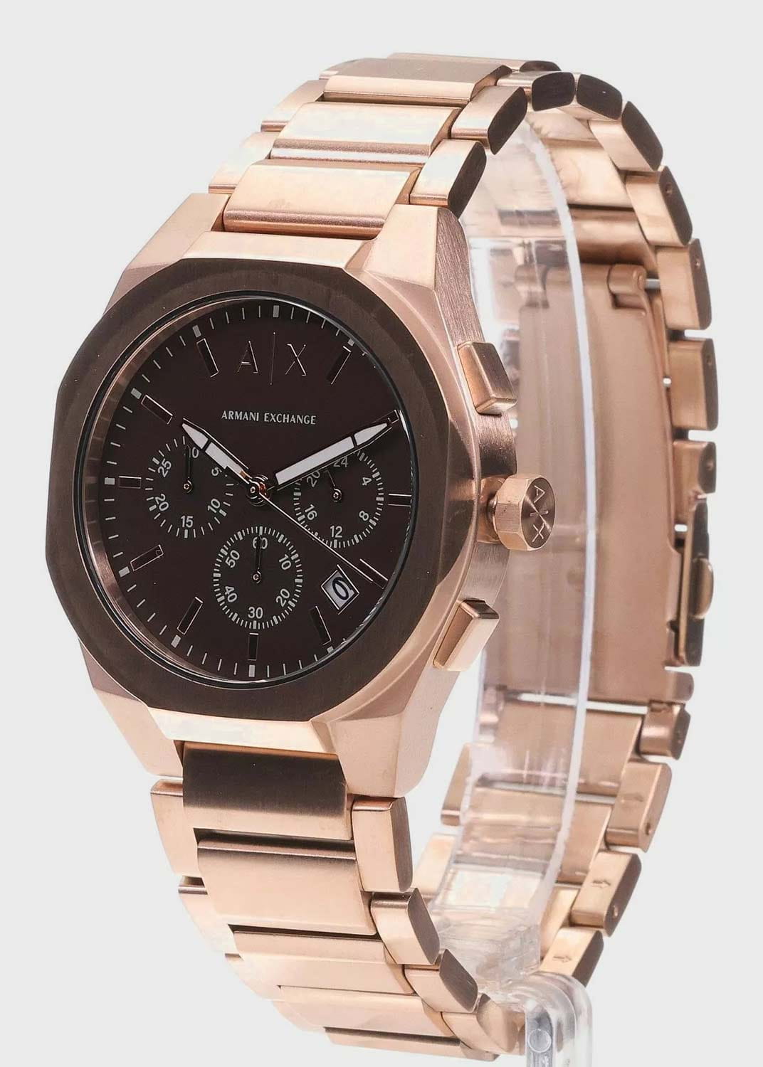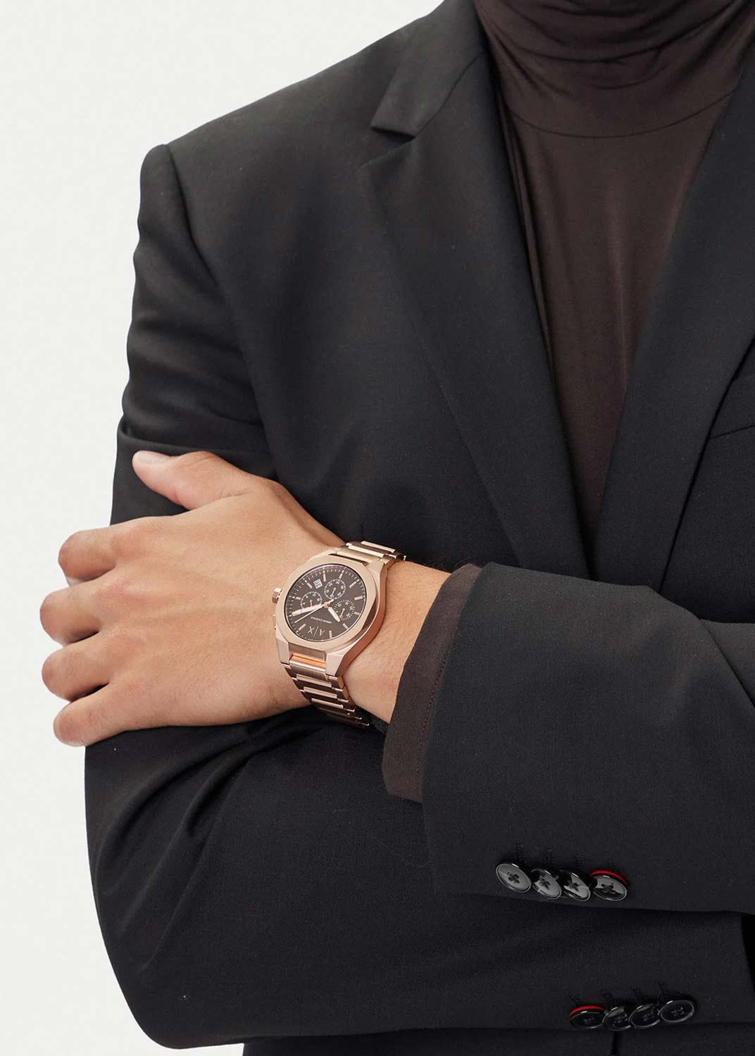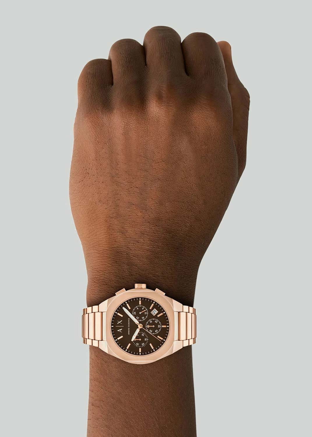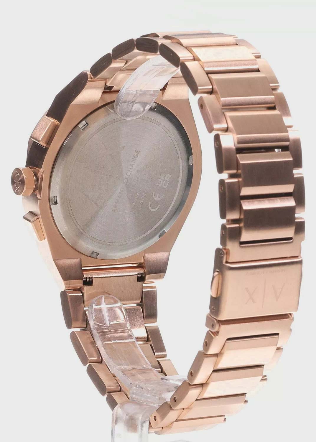 Мужские наручные часы-хронографХронографФункция позволяет измерять отрезки времени с особой точностью: часы, минуты, секунды. Верным признаком хронографа является наличие на циферблате 3 дополнительных окошек-счётчиков. с секундомеромСекундомерСекундоме́р — прибор, способный измерять интервалы времени с точностью до долей секунды. Armani Exchange Rafael AX4188 кварцевый механизм с высокой точностью. Корпус  часов изготовлены из нержавеющей стали с IP-покрытиемIP-покрытиеМетод ионного напыления. Демонстрирует повышенную устойчивость к истиранию, окислению и химическим веществам. Под воздействием высокого давления и температуры около 1500°C молекулы металла надёжно соединяются с частицами корпуса часов. цвета розового золота. Минеральное стеклоМинеральное стеклоМинеральное стекло представляет собой искусственно выращенный минерал кварца. Такое стекло отличается особой устойчивостью к повреждениям и царапинам. Уступает по некоторым качествам сапфировому стеклу. защищает их от царапин и повреждений, сохраняя первозданный вид даже при активном использовании. Окошко даты находится в положении между 4 и 5 часов. Стрелки с люминесцентным покрытиемЛюминесцентное покрытиеПозволяет считывать показания времени в темноте. Производители наносят на стрелки, часовые индексы, безель или поверхность циферблата светонакопительный состав, дающий холодное свечение.. 12-ти и 24-х часовой формат времени. Стальной браслет с IP-покрытиемIP-покрытиеМетод ионного напыления. Демонстрирует повышенную устойчивость к истиранию, окислению и химическим веществам. Под воздействием высокого давления и температуры около 1500°C молекулы металла надёжно соединяются с частицами корпуса часов. на раскладной застёжкеРаскладная застёжкаТакой тип застёжки используется только на браслетах из металла. Она никогда не раскрывается полностью, происходит разделение на 2 и более частей. Раскладывающая застёжка снизит вероятность потери часов к минимуму. обеспечивает надежную фиксацию на запястье. Класс водозащиты: 50 метров позволит защитить корпус от случайных брызг или капель дождя. Эта модель – отличный выбор для тех, кто ищет сочетание стиля, качества и функциональности. Часы станут не только полезным аксессуаром, но и выразительным элементом вашего имиджа.