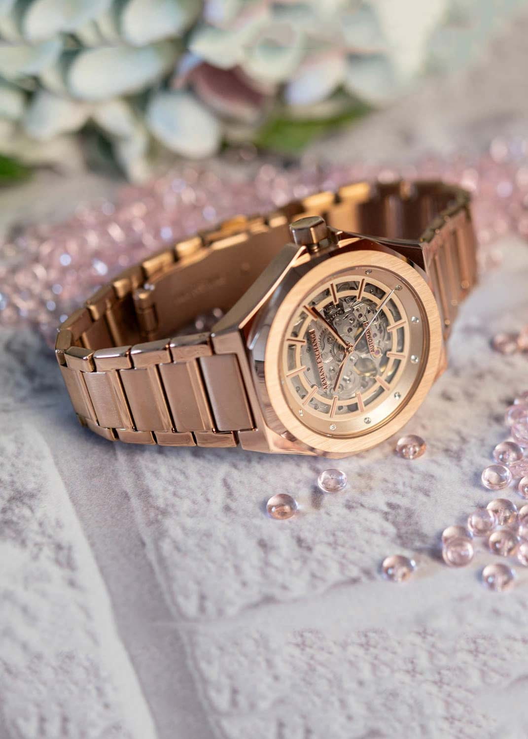 Женские механические часы-скелетоны с автоподзаводом Armani Exchange Andrea AX4619 - это отражение вашего динамичного образа жизни и безупречного вкуса. Эти часы созданы для тех, кто ценит в аксессуарах не только эстетику, но и практичность, кто стремится к совершенству в каждой детали. Корпус часов изготовлены из нержавеющей стали с IP-покрытиемIP-покрытиеМетод ионного напыления. Демонстрирует повышенную устойчивость к истиранию, окислению и химическим веществам. Под воздействием высокого давления и температуры около 1500°C молекулы металла надёжно соединяются с частицами корпуса часов. цвета розового золота, диаметром 36 мм. Минеральное стеклоМинеральное стеклоМинеральное стекло представляет собой искусственно выращенный минерал кварца. Такое стекло отличается особой устойчивостью к повреждениям и царапинам. Уступает по некоторым качествам сапфировому стеклу. защищает от царапин и повреждений, сохраняя первозданный вид даже при активном использовании. Стальной браслет с IP-покрытиемIP-покрытиеМетод ионного напыления. Демонстрирует повышенную устойчивость к истиранию, окислению и химическим веществам. Под воздействием высокого давления и температуры около 1500°C молекулы металла надёжно соединяются с частицами корпуса часов. на раскладной застёжкеРаскладная застёжкаТакой тип застёжки используется только на браслетах из металла. Она никогда не раскрывается полностью, происходит разделение на 2 и более частей. Раскладывающая застёжка снизит вероятность потери часов к минимуму. обеспечивает надежную фиксацию на запястье. Класс водозащиты: 50 метров позволит защитить корпус от случайных брызг или капель дождя. Эта модель – отличный выбор для тех, кто ищет сочетание стиля, качества и функциональности. Часы станут не только полезным аксессуаром, но и выразительным элементом вашего имиджа.