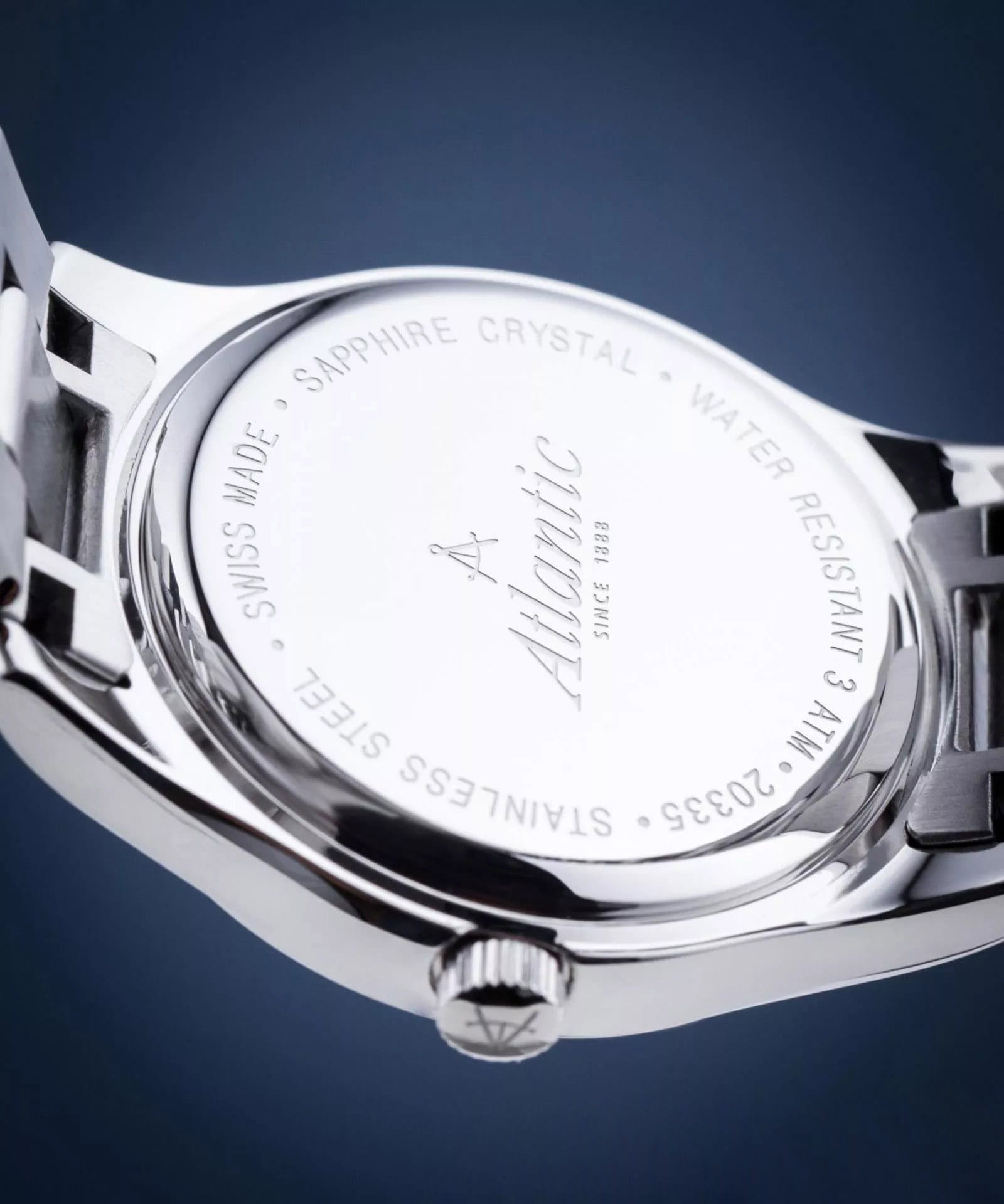 Женские швейцарские часы Atlantic Seapair Ladies 20335.41.91TQ , кварцевый механизм с высокой точностью. Циферблат часов с люминесцентным покрытиемЛюминесцентное покрытиеПозволяет считывать показания времени в темноте. Производители наносят на стрелки, часовые индексы, безель или поверхность циферблата светонакопительный состав, дающий холодное свечение. стрелок и меток, дополнен сапфировым стекломСапфировое стеклоПрочный и надёжный материал из кристалла сапфира синтетического происхождения, характеризующийся особой твёрдостью и устойчивостью к царапинам и повреждениям., устойчивым к появлению царапин и обладающее высокой прозрачностью. Класс водозащиты: 30 метров, позволит защитить корпус от случайных брызг или капель дождя. Корпус часов изготовлен из нержавеющей стали. Стальной браслет с раскладной застёжкойРаскладная застёжкаТакой тип застёжки используется только на браслетах из металла. Она никогда не раскрывается полностью, происходит разделение на 2 и более частей. Раскладывающая застёжка снизит вероятность потери часов к минимуму..