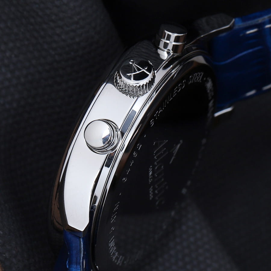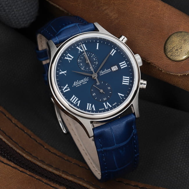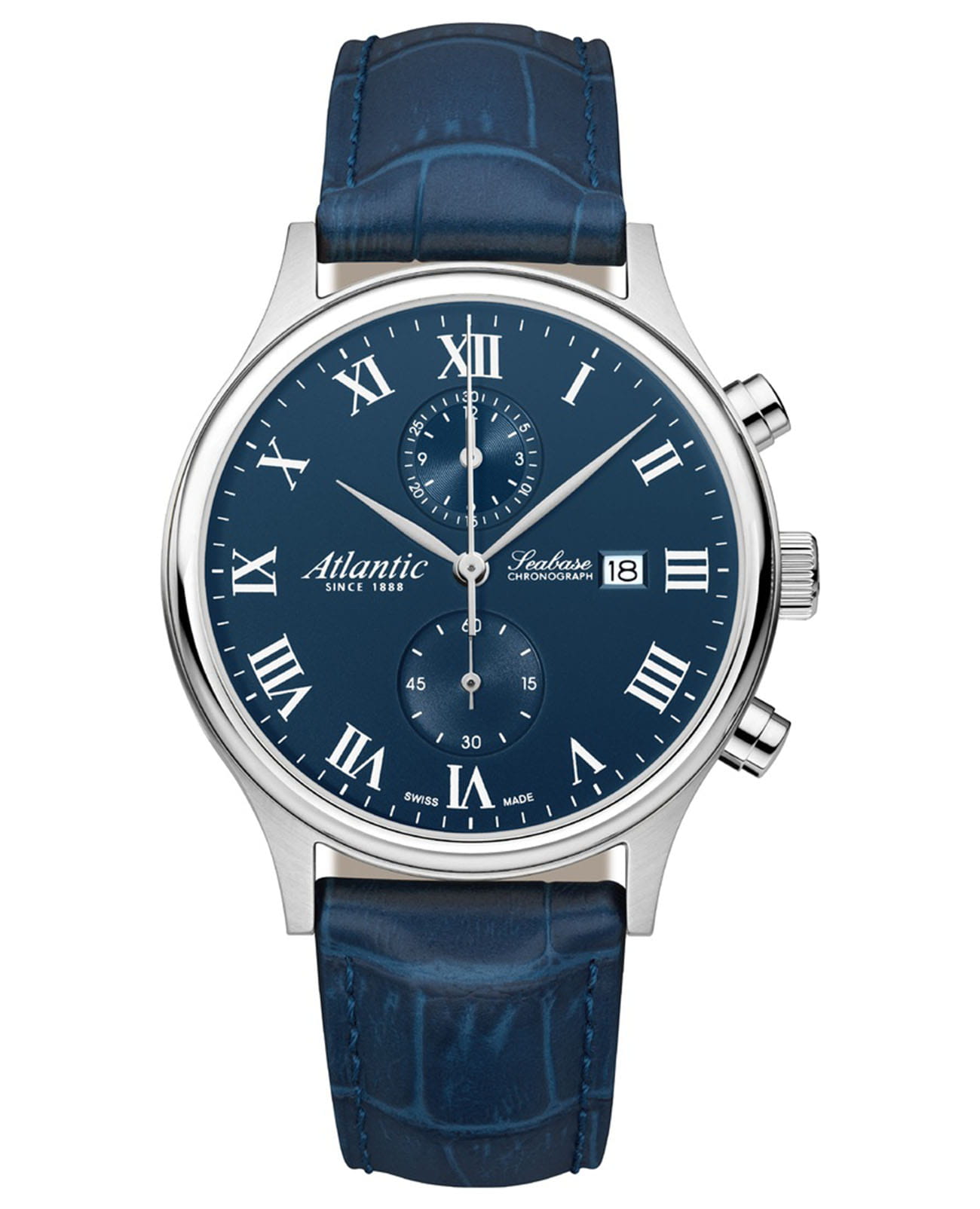 Мужские швейцарские часы-хронографХронографФункция позволяет измерять отрезки времени с особой точностью: часы, минуты, секунды. Верным признаком хронографа является наличие на циферблате 3 дополнительных окошек-счётчиков. с секундомеромСекундомерСекундоме́р — прибор, способный измерять интервалы времени с точностью до долей секунды. Atlantic Seabase 64452.41.58, кварцевый механизм с высокой точностью. Cапфировое стеклоСапфировое стеклоПрочный и надёжный материал из кристалла сапфира синтетического происхождения, характеризующийся особой твёрдостью и устойчивостью к царапинам и повреждениям. устойчивое к появлению царапин и обладающее высокой прозрачностью. Корпус часов изготовлен из нержавеющей стали. На циферблате расположены два дополнительных индикатора, окошко даты в положении 3 часов. Класс водозащиты: 50 метров, позволит защитить корпус от случайных брызг или капель дождя. Кожаный ремешок на стандартной застежке.
