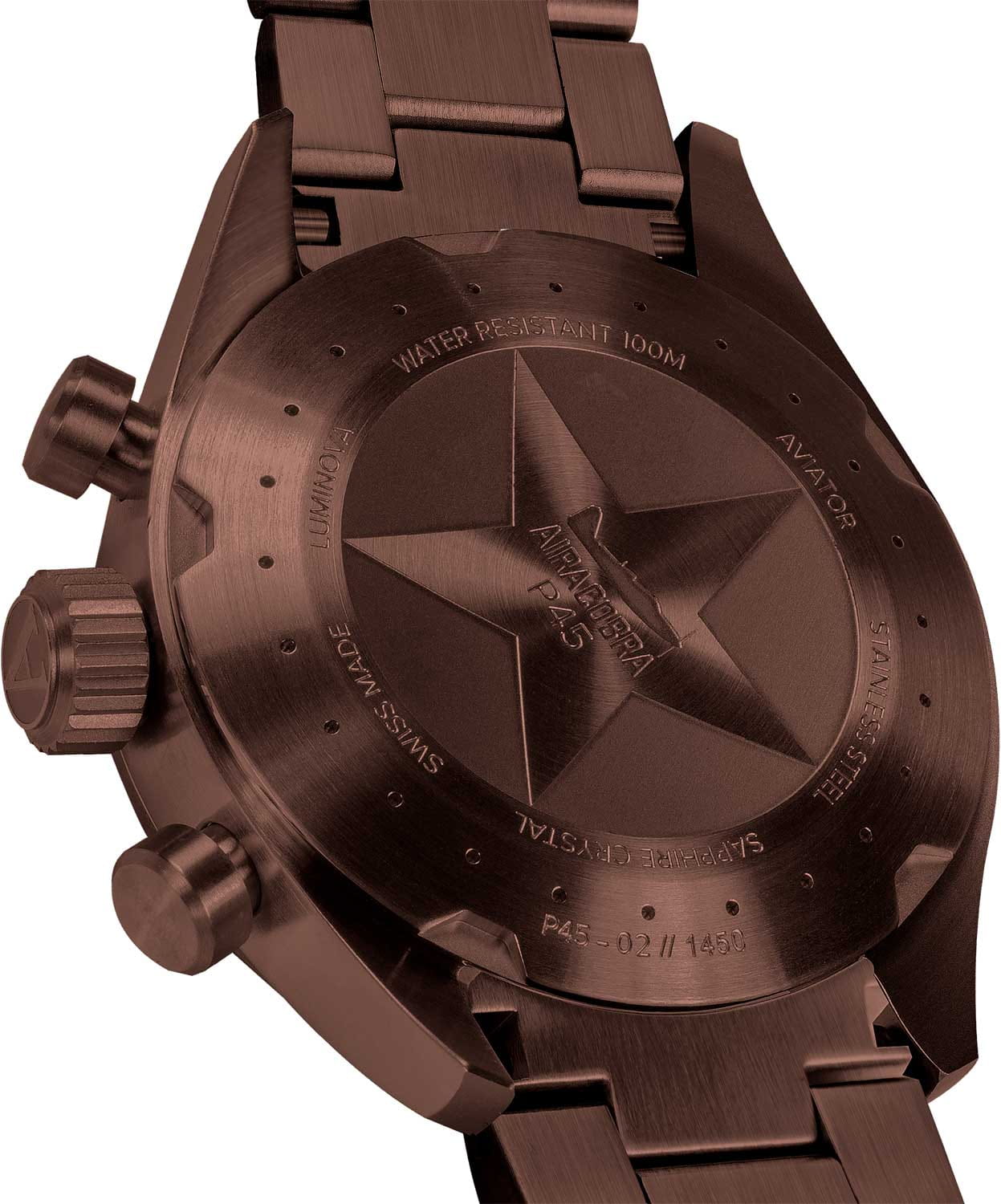 Aviator Airacobra P45 Chrono V.2.25.8.172.5 — швейцарские часы в духе пилотских инструментов, объединяющий точность, удобство и лаконичный дизайн. Диаметр корпуса — 45 мм, выполнен из нержавеющей стали 316L с PVD-покрытиемPVDУльтратонкое покрытие наносится в технике вакуумного напыления, сочетает в себе нитрид титана особой прочности со слоем золота или оксида хрома. Несёт в себе декоративную или защитную функцию., что подчёркивает техническую надёжность в образе часов. Циферблат оформлен в классическом aviator-стиле: крупные арабские цифры, широкие стрелки и чёткое деление минут позволяют считывать время мгновенно. Стрелки и метки покрыты люминесцентным покрытиемЛюминесцентное покрытиеПозволяет считывать показания времени в темноте. Производители наносят на стрелки, часовые индексы, безель или поверхность циферблата светонакопительный состав, дающий холодное свечение. Superluminova для отличной читаемости при слабом освещении. Циферблат защищён стойким сапфировым стекломСапфировое стеклоПрочный и надёжный материал из кристалла сапфира синтетического происхождения, характеризующийся особой твёрдостью и устойчивостью к царапинам и повреждениям. с антибликовым покрытиемАнтибликовое покрытиеСлой оксида металла в 0,13-0,3 микрон, благодаря которому стекло часов не бликует и не отражает свет. Антибликовое покрытие уменьшает отражение света в 10 раз, обеспечивая отличную читаемость показателей циферблата.. У модели присутствуют дата и точный откидной механизм завинчивающейся заводной головки и задней крышки, обеспечивающий надёжную водозащиту до 100 м и защиту от ударов. Внутри установлен швейцарский кварцевый механизм, который обеспечивает функции хронографаХронографФункция позволяет измерять отрезки времени с особой точностью: часы, минуты, секунды. Верным признаком хронографа является наличие на циферблате 3 дополнительных окошек-счётчиков.. Функции добавить (ADD) и разделить (SPLIT). Часы комплектуются браслетом из нержавеющей стали с PVD-покрытиемPVDУльтратонкое покрытие наносится в технике вакуумного напыления, сочетает в себе нитрид титана особой прочности со слоем золота или оксида хрома. Несёт в себе декоративную или защитную функцию. с удобной раскладной застёжкойРаскладная застёжкаТакой тип застёжки используется только на браслетах из металла. Она никогда не раскрывается полностью, происходит разделение на 2 и более частей. Раскладывающая застёжка снизит вероятность потери часов к минимуму., обеспечивающей надёжную фиксацию и комфорт при ежедневной носке. Эти изысканные часы так же обладают функциями тахиметраТахиметрРазмеченная шкала, располагается на ободке или безеле часов. Тахиметр позволяет рассчитать скорость на определённом участке пути, расстояние измеряется в километрах или милях., секундомераСекундомерСекундоме́р — прибор, способный измерять интервалы времени с точностью до долей секунды. и телеметра. Airacobra — это практичный и стильный инструмент для путешествий и активной повседневности, объединяющий авиационную эстетику, точный механизм и удобство.