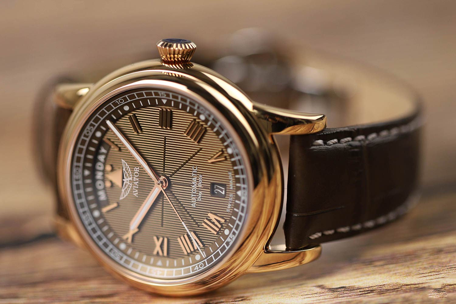 Aviator Douglas Day Date V.3.35.2.280.4 — швейцарские часы в классике авиадизайна, сочетающие безупречную читаемость и высокую надёжность. Лимитированная серия. Корпус диаметром 41,2 мм выполнен из нержавеющей стали 316L с PVD-покрытиемPVDУльтратонкое покрытие наносится в технике вакуумного напыления, сочетает в себе нитрид титана особой прочности со слоем золота или оксида хрома. Несёт в себе декоративную или защитную функцию. цвета розового золота. Накладные метки выполнены в виде римских цифр. Окошко даты находится в положении 6 часов. День недели находится в положении 12 часов. Часовые метки и стрелки покрыты люминесцентным покрытиемЛюминесцентное покрытиеПозволяет считывать показания времени в темноте. Производители наносят на стрелки, часовые индексы, безель или поверхность циферблата светонакопительный состав, дающий холодное свечение. Superluminova, позволяющим легко определять время даже в тёмное время суток. Поверхность защищена прочным сапфировым стекломСапфировое стеклоПрочный и надёжный материал из кристалла сапфира синтетического происхождения, характеризующийся особой твёрдостью и устойчивостью к царапинам и повреждениям. с антибликовым покрытием, устойчивым к царапинам. Сердце модели — швейцарский механизм Sellita SW 240-2, известный своей точностью и долговечностью. Водозащита 100 метров, позволит плавать, нырять и заниматься другими водными видами спорта. Завинчивающаяся головка и задняя крышка обеспечивают уверенную ударопрочностьУдаропрочный корпусМеханизм заключён в корпус, выполненный из современных материалов, устойчивых к ударам, механическим повреждениям и падению с высоты: инновационный пластик, карбон, нержавеющая сталь, титан. и надёжную защиту от влаги и пыли. В механизме 26 камней, запас хода до 41 час. Модель дополнена кожаным ремешком с выразительной текстурой и классическим стилем, закреплённым с помощью застёжке-бабочке с кнопкамиЗастёжка "бабочка"Такой вид застёжки дополняется предохранителями, помогающими избежать случайного раскрытия браслета. Обладают изящным исполнением. — для максимального комфорта и лёгкости в повседневном использовании. Модель вдохновлена американским пассажирским самолетом Douglas DC-3, который является одним из лучших самолетов за всю историю авиации. Aviator — это образец лётной точности, инженерной чёткости и сдержанной роскоши, идеально подходящий для тех, кто ценит функциональность и уверенность в каждом элементе.