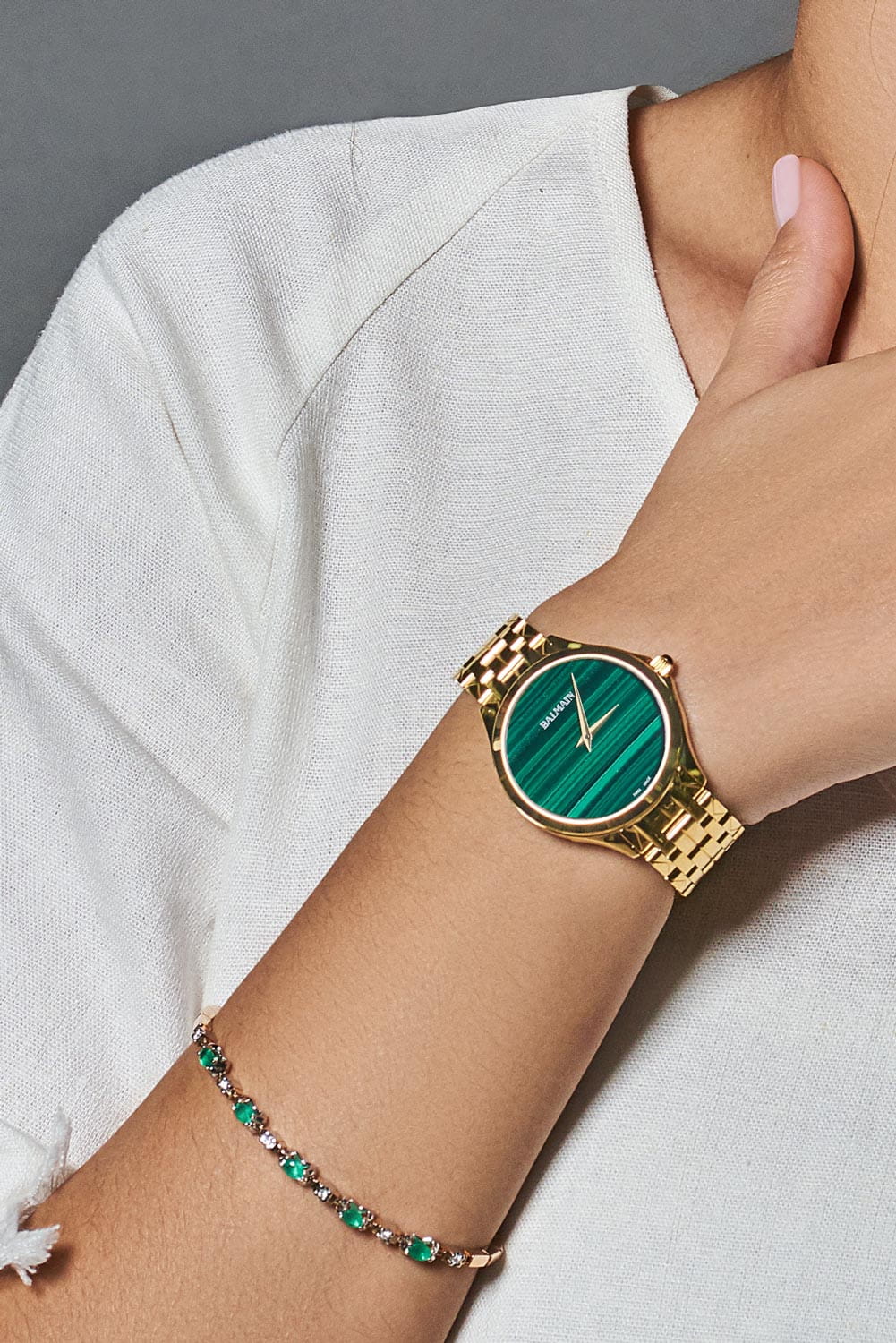 Женские часы Balmain Flamea B4790.33.75 кварцевый механизм с высокой точностью. Сапфировое стеклоСапфировое стеклоПрочный и надёжный материал из кристалла сапфира синтетического происхождения, характеризующийся особой твёрдостью и устойчивостью к царапинам и повреждениям. устойчивое к появлению царапин, обладающее высокой прозрачностью. Корпус изготовлен из нержавеющей стали PVD-покрытиемPVDУльтратонкое покрытие наносится в технике вакуумного напыления, сочетает в себе нитрид титана особой прочности со слоем золота или оксида хрома. Несёт в себе декоративную или защитную функцию.. Класс водозащиты: 50 метров, позволит защитить корпус от случайных брызг или капель дождя. Стальной браслет с PVD-покрытиемPVDУльтратонкое покрытие наносится в технике вакуумного напыления, сочетает в себе нитрид титана особой прочности со слоем золота или оксида хрома. Несёт в себе декоративную или защитную функцию.. на застёжке «бабочка» с кнопкамиЗастёжка "бабочка"Такой вид застёжки дополняется предохранителями, помогающими избежать случайного раскрытия браслета. Обладают изящным исполнением. . БезельБезельВнешний ободок, закрепляющий стекло. В спортивных часах так называется поворотное кольцо с делениями на циферблате, выполняет роль таймера – замеряет отрезки времени на шкале. Неподвижный безель – элемент декора. Однонаправленно вращающийся безель на дайверских часах позволяет фиксировать моменты погружения и выныривания на поверхность. с PVD-покрытиемPVDУльтратонкое покрытие наносится в технике вакуумного напыления, сочетает в себе нитрид титана особой прочности со слоем золота или оксида хрома. Несёт в себе декоративную или защитную функцию..