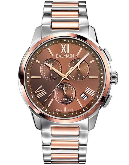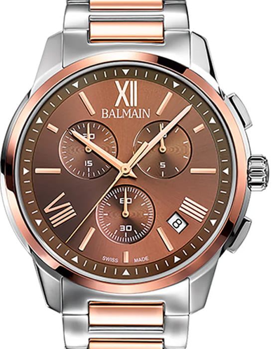 Женские часы Balmain Madrigal B7488.33.52 c хронографомХронографФункция позволяет измерять отрезки времени с особой точностью: часы, минуты, секунды. Верным признаком хронографа является наличие на циферблате 3 дополнительных окошек-счётчиков. кварцевый механизм с высокой точностью. Сапфировое стеклоСапфировое стеклоПрочный и надёжный материал из кристалла сапфира синтетического происхождения, характеризующийся особой твёрдостью и устойчивостью к царапинам и повреждениям. устойчивое к появлению царапин, обладающее высокой прозрачностью. Корпус изготовлен из нержавеющей стали PVD-покрытиемPVDУльтратонкое покрытие наносится в технике вакуумного напыления, сочетает в себе нитрид титана особой прочности со слоем золота или оксида хрома. Несёт в себе декоративную или защитную функцию.. Класс водозащиты: 50 метров, позволит защитить корпус от случайных брызг или капель дождя. Стальной браслет с PVD-покрытиемPVDУльтратонкое покрытие наносится в технике вакуумного напыления, сочетает в себе нитрид титана особой прочности со слоем золота или оксида хрома. Несёт в себе декоративную или защитную функцию.. на застёжке «бабочка» с кнопкамиЗастёжка "бабочка"Такой вид застёжки дополняется предохранителями, помогающими избежать случайного раскрытия браслета. Обладают изящным исполнением. . БезельБезельВнешний ободок, закрепляющий стекло. В спортивных часах так называется поворотное кольцо с делениями на циферблате, выполняет роль таймера – замеряет отрезки времени на шкале. Неподвижный безель – элемент декора. Однонаправленно вращающийся безель на дайверских часах позволяет фиксировать моменты погружения и выныривания на поверхность. с PVD-покрытиемPVDУльтратонкое покрытие наносится в технике вакуумного напыления, сочетает в себе нитрид титана особой прочности со слоем золота или оксида хрома. Несёт в себе декоративную или защитную функцию..