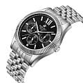 Циферблат оформлен с изысканной симметрией: три отдельных индикатора отображают день недели, дату и 24-часовой формат. Арабские цифры и декоративные акценты придают дизайну лёгкость и выразительность. Стрелки и метки обеспечивают удобное считывание показаний в течение дня.