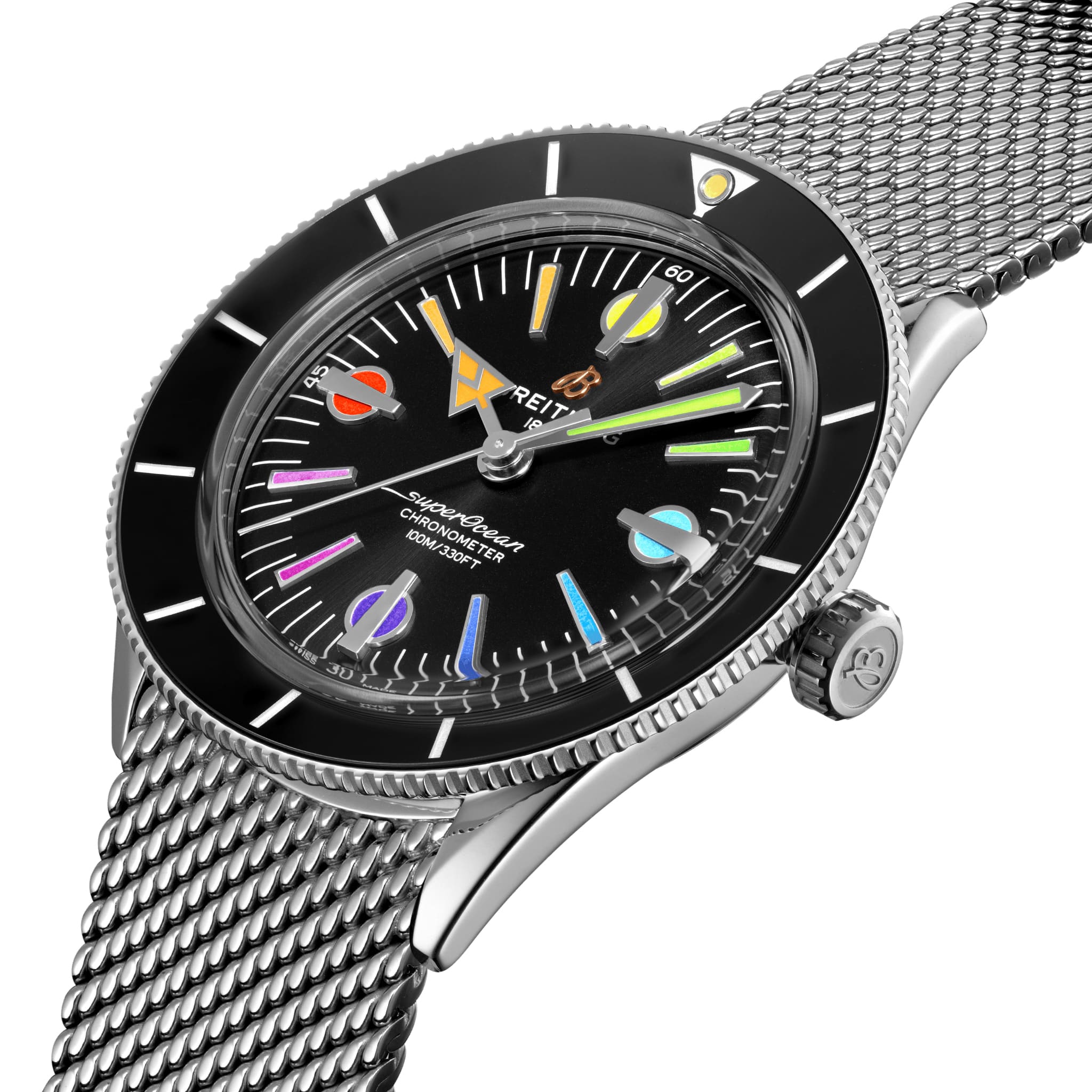 Эта яркая модель представлена лимитированной серией из 1000 экземпляров. Как и оригинальные SuperOcean, новые часы имеют две характерные особенности: на 42-миллиметровом корпусе из нержавеющей стали установлен вращающийся в оба направления вогнутый керамический безель, а на циферблате выделяются крупные метки.