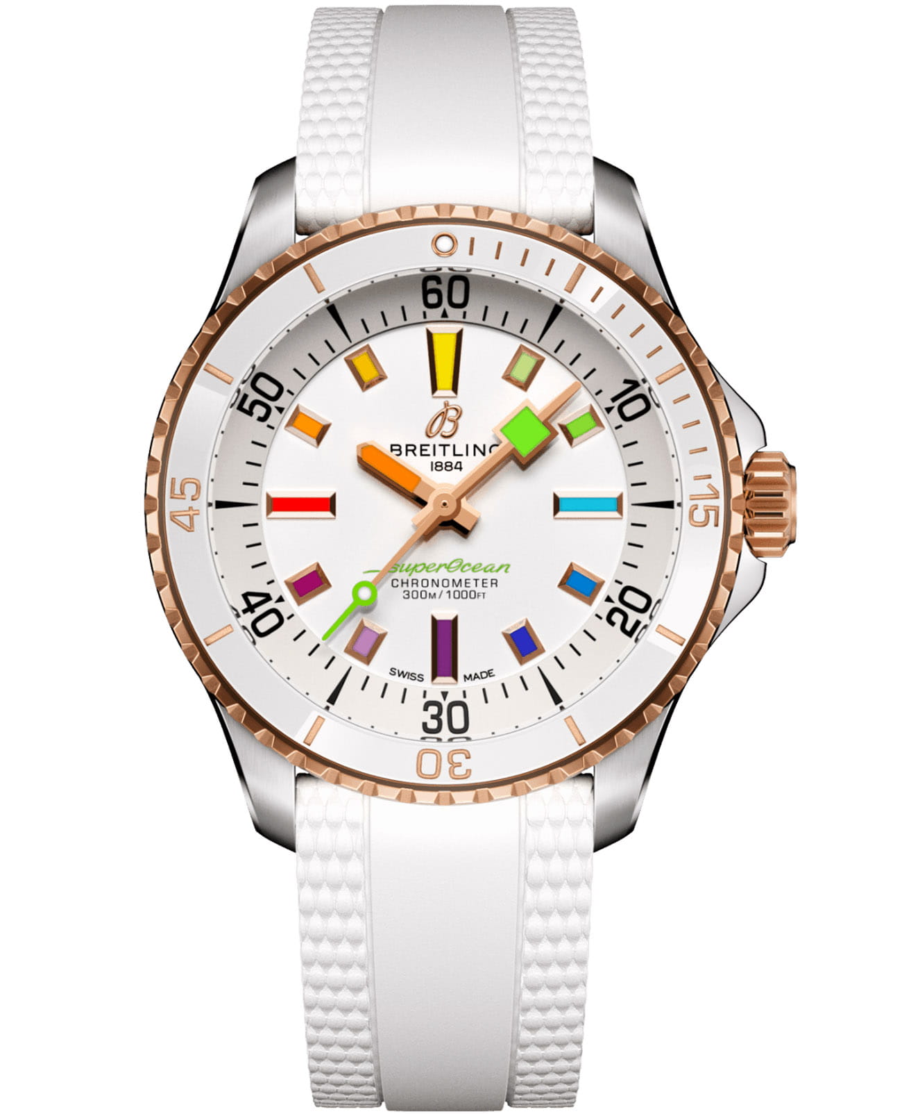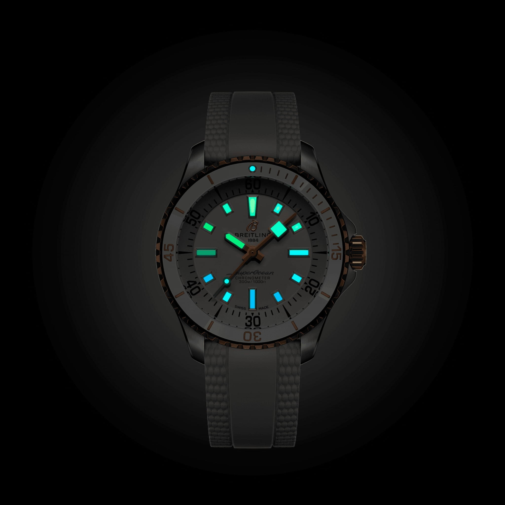 . Каучуковый ремешок на раскладной застёжкеРаскладная застёжкаТакой тип застёжки используется только на браслетах из металла. Она никогда не раскрывается полностью, происходит разделение на 2 и более частей. Раскладывающая застёжка снизит вероятность потери часов к минимуму.. Новый Superocean повторяет знаменитые дизайнерские коды Slow Motion, добавляя при этом современные элементы, такие как безель с керамической вставкой и яркие циферблаты. Стрелки и метки с люминесцентным покрытиемЛюминесцентное покрытиеПозволяет считывать показания времени в темноте. Производители наносят на стрелки, часовые индексы, безель или поверхность циферблата светонакопительный состав, дающий холодное свечение.. Вращающийся стальной безельБезельВнешний ободок, закрепляющий стекло. В спортивных часах так называется поворотное кольцо с делениями на циферблате, выполняет роль таймера – замеряет отрезки времени на шкале. Неподвижный безель – элемент декора. Однонаправленно вращающийся безель на дайверских часах позволяет фиксировать моменты погружения и выныривания на поверхность. с люминесцентным покрытием Superluminova из нержавеющей стали и керамики, защищенный от царапин, никогда не изнашивается и не выцветает. Лучше всего то, что это больше не просто часы для дайвинга — занимайтесь с ними серфингом, плавайте с ними, заходите с ними в пляжный бар, а затем надевайте их на ужин. Superocean идеально сочетает ностальгию по своему наследию со свежим внешним видом.