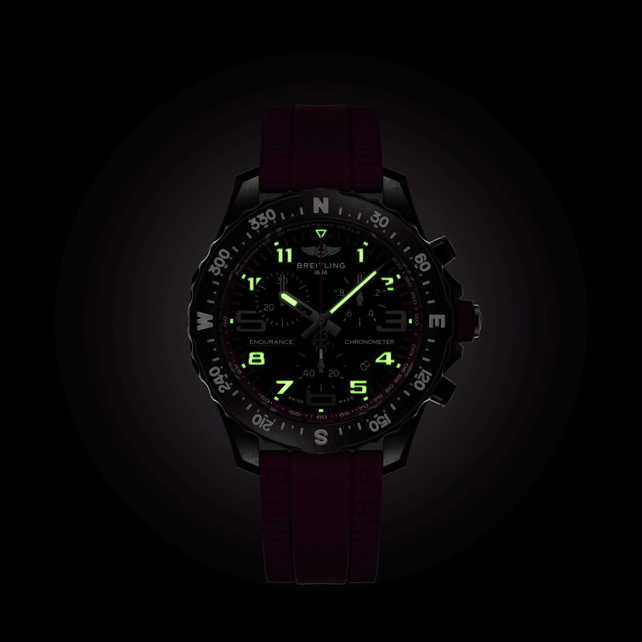 Швейцарские часы Breitling Endurance Pro 38 X83310F61B1S1. Корпус часов изготовлен из прочного сверхлегкого материала Breitlight. Класс водозащиты: 100 метров, позволит плавать, нырять и заниматься другими водными видами спорта. Стрелки с люминесцентным покрытиемЛюминесцентное покрытиеПозволяет считывать показания времени в темноте. Производители наносят на стрелки, часовые индексы, безель или поверхность циферблата светонакопительный состав, дающий холодное свечение.. Сапфировое стеклоСапфировое стеклоПрочный и надёжный материал из кристалла сапфира синтетического происхождения, характеризующийся особой твёрдостью и устойчивостью к царапинам и повреждениям. устойчивое к появлению царапин, обладающее высокой прозрачностью. Каучуковый ремешок.