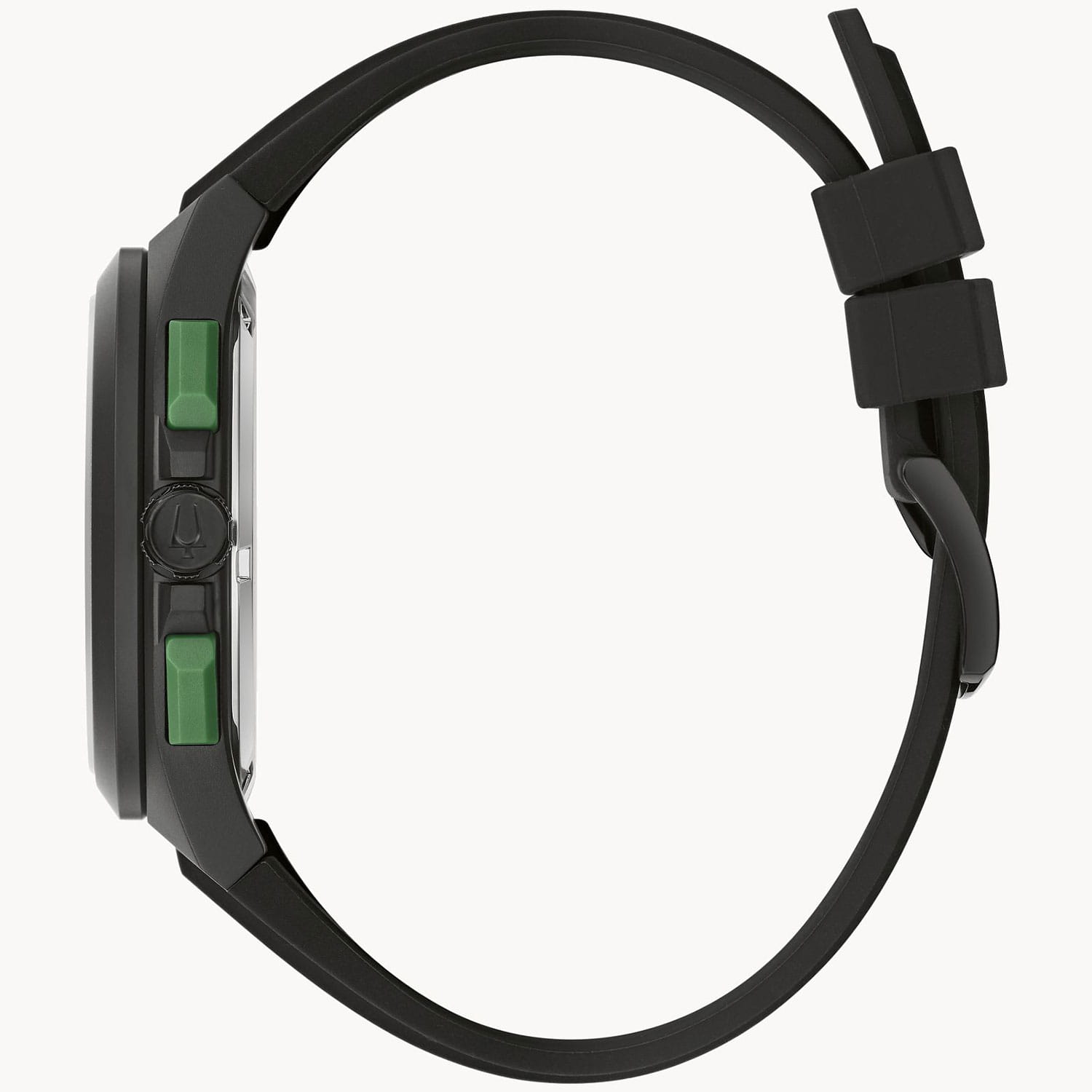 Мужские кварцевые часы-хронографХронографФункция позволяет измерять отрезки времени с особой точностью: часы, минуты, секунды. Верным признаком хронографа является наличие на циферблате 3 дополнительных окошек-счётчиков. Bulova Maquina 98B381 – отражающий идеальное сочетание современного дизайна, надёжности и функциональности. Элегантный облик станет превосходным завершением образа, наделив его индивидуальным характером. Корпус из нержавеющей стали с IP-покрытиемIP-покрытиеМетод ионного напыления. Демонстрирует повышенную устойчивость к истиранию, окислению и химическим веществам. Под воздействием высокого давления и температуры около 1500°C молекулы металла надёжно соединяются с частицами корпуса часов., диаметром 46 мм идеально сбалансирован и элегантен. Защиту циферблата обеспечивает прочное сапфировое стеклоСапфировое стеклоПрочный и надёжный материал из кристалла сапфира синтетического происхождения, характеризующийся особой твёрдостью и устойчивостью к царапинам и повреждениям. гарантирующее четкость показаний. Центральные часовая и минутная стрелки. Силиконовый ремешок со стандартной застежкой обеспечивает комфортное ношение. Апертура даты в позиции 3 часов. Водозащита 100 метров позволит плавать, нырять и заниматься другими водными видами спорта. Стрелки и метки с люминесцентным покрытиемЛюминесцентное покрытиеПозволяет считывать показания времени в темноте. Производители наносят на стрелки, часовые индексы, безель или поверхность циферблата светонакопительный состав, дающий холодное свечение. позволяющие легко определять время даже в темноте. Эта модель – отличный выбор для тех, кто ищет сочетание стиля, качества и функциональности. Часы станут не только полезным аксессуаром, но и выразительным элементом вашего имиджа.