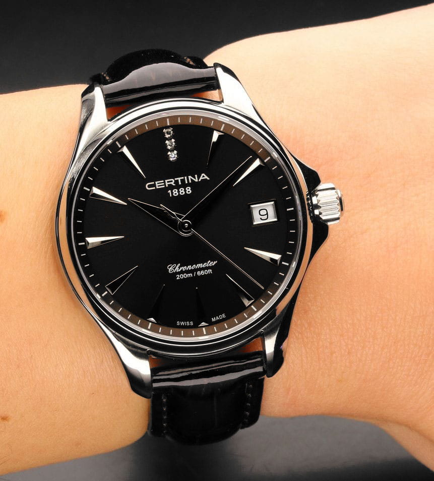 Стильный аксессуар создан для девушек, которые стремятся быть неотразимыми в любой ситуации. Лаконичный чёрный циферблат инкрустирован 3 сияющими бриллиантами оттенка Top Wesselton, расположенных на позиции 12 часов. Модель отличается максимальной точностью хода швейцарского кварцевого калибра ETA F06.411 и обладает статусом хронометра, есть подтверждающий сертификат COSCСертификат COSCОфициальный сертификат, подтверждающий то, что часы ходят с особо высокой точностью. Для получения документа часы подвергаются тестовым испытаниям, разработанным швейцарским институтом тестирования хронометров COSC. Допустимая норма для механических часов -4/+6 секунд в день, для кварцевых моделей +/- 0,07 секунд в день.. Стекло из сапфира с односторонним антибликовым покрытием. Концепция Double SecurityDS ConceptDouble Security Concept, обозначает двойную надёжность и безупречную точность часов Certina. Двойная система защиты подразумевает обеспечение максимальной устойчивости к ударам и высоких показателей водонепроницаемости.. Завинчивающаяся задняя крышка. Лакированный кожаный ремешок с . Стальной ударопрочный корпусУдаропрочный корпусМеханизм заключён в корпус, выполненный из современных материалов, устойчивых к ударам, механическим повреждениям и падению с высоты: инновационный пластик, карбон, нержавеющая сталь, титан.. Степень водонепроницаемости WR 200. Индикатор EOLEOLПредставляет собой систему, уведомляющую владельца часов о необходимости замены элемента питания. За 2 недели до полного разряда батарейки секундная стрелка перестаёт ходить чётко и начинает перепрыгивать на 3-4 деления., календарное окошко. Диаметр корпуса: 33,8 мм.