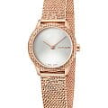 Гармонично сочетаются фактурный безельБезельВнешний ободок, закрепляющий стекло. В спортивных часах так называется поворотное кольцо с делениями на циферблате, выполняет роль таймера – замеряет отрезки времени на шкале. Неподвижный безель – элемент декора. Однонаправленно вращающийся безель на дайверских часах позволяет фиксировать моменты погружения и выныривания на поверхность. с браслетом плетения Mesh. Привлекательно выглядит игра оттенков серебристого циферблата «солнечные лучи» и PVD-покрытияPVDУльтратонкое покрытие наносится в технике вакуумного напыления, сочетает в себе нитрид титана особой прочности со слоем золота или оксида хрома. Несёт в себе декоративную или защитную функцию. цвета розового золота. Швейцарский кварцевый калибр от ETA. Минеральное стекло. Водонепроницаемость до 3 бар.