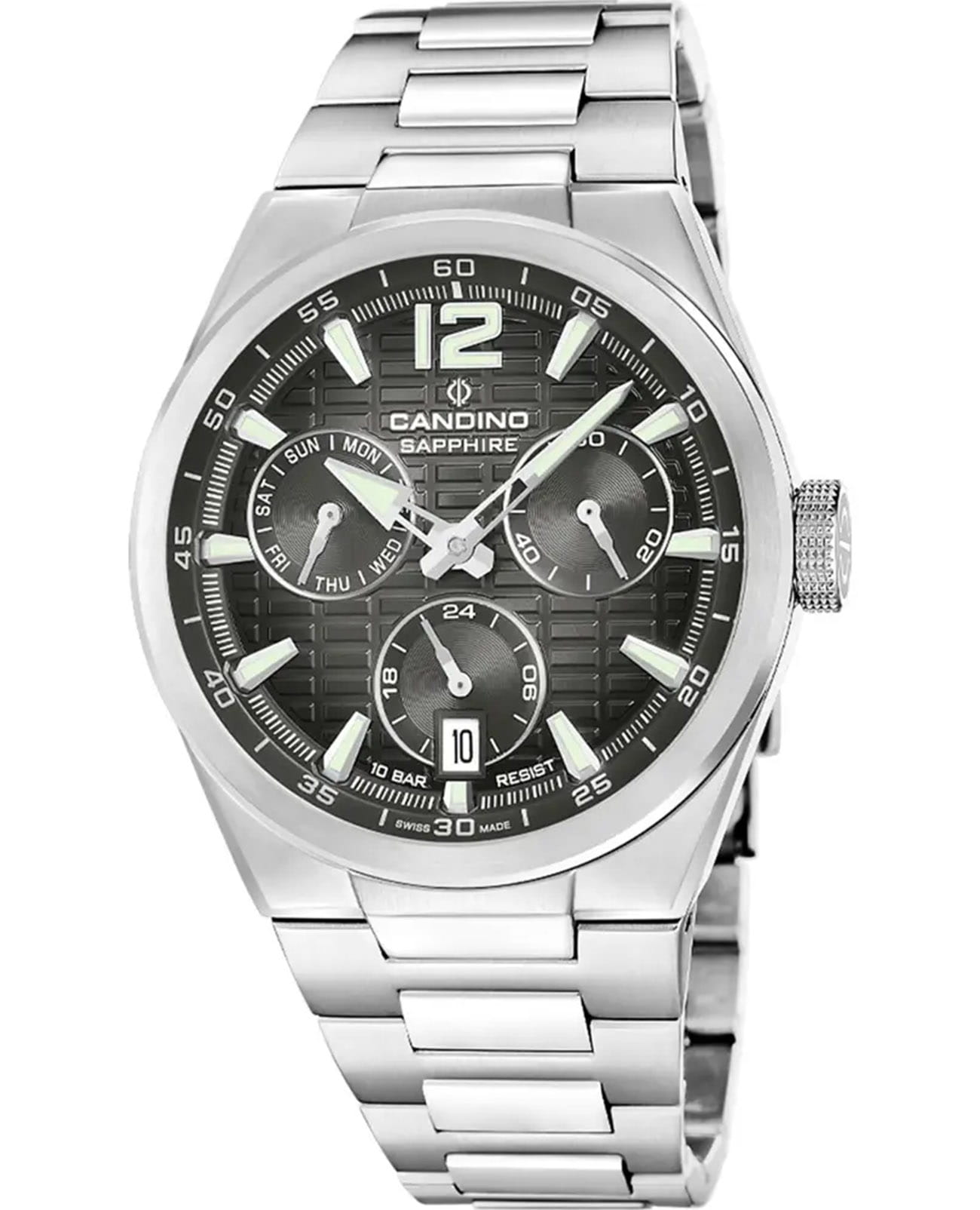 Мужские кварцевые часы Candino — это сочетание классического дизайна, надёжности и швейцарского качества. Корпус диаметром 43 мм и толщиной 11,5 мм выполнен из нержавеющей стали. Циферблат чёрного цвета оформлен индексами в виде штрихов и стрелками. Указатели дня недели и даты расположены в центре циферблата. Стрелки и метки с люминесцентным покрытиемЛюминесцентное покрытиеПозволяет считывать показания времени в темноте. Производители наносят на стрелки, часовые индексы, безель или поверхность циферблата светонакопительный состав, дающий холодное свечение., обеспечивающим хорошую читаемость в темноте. Циферблат защищён сапфировым стекломСапфировое стеклоПрочный и надёжный материал из кристалла сапфира синтетического происхождения, характеризующийся особой твёрдостью и устойчивостью к царапинам и повреждениям., устойчивым к царапинам. Механизм — кварцевый произведённый в Швейцарии. Часы оснащены стальным браслетом с раскладной застёжкойРаскладная застёжкаТакой тип застёжки используется только на браслетах из металла. Она никогда не раскрывается полностью, происходит разделение на 2 и более частей. Раскладывающая застёжка снизит вероятность потери часов к минимуму.. Водонепроницаемость 100 м позволяет использовать часы для плавания и повседневного ношения. Гарантия — 2 года. Идеальный выбор для тех, кто ценит стиль, функциональность и точность.