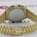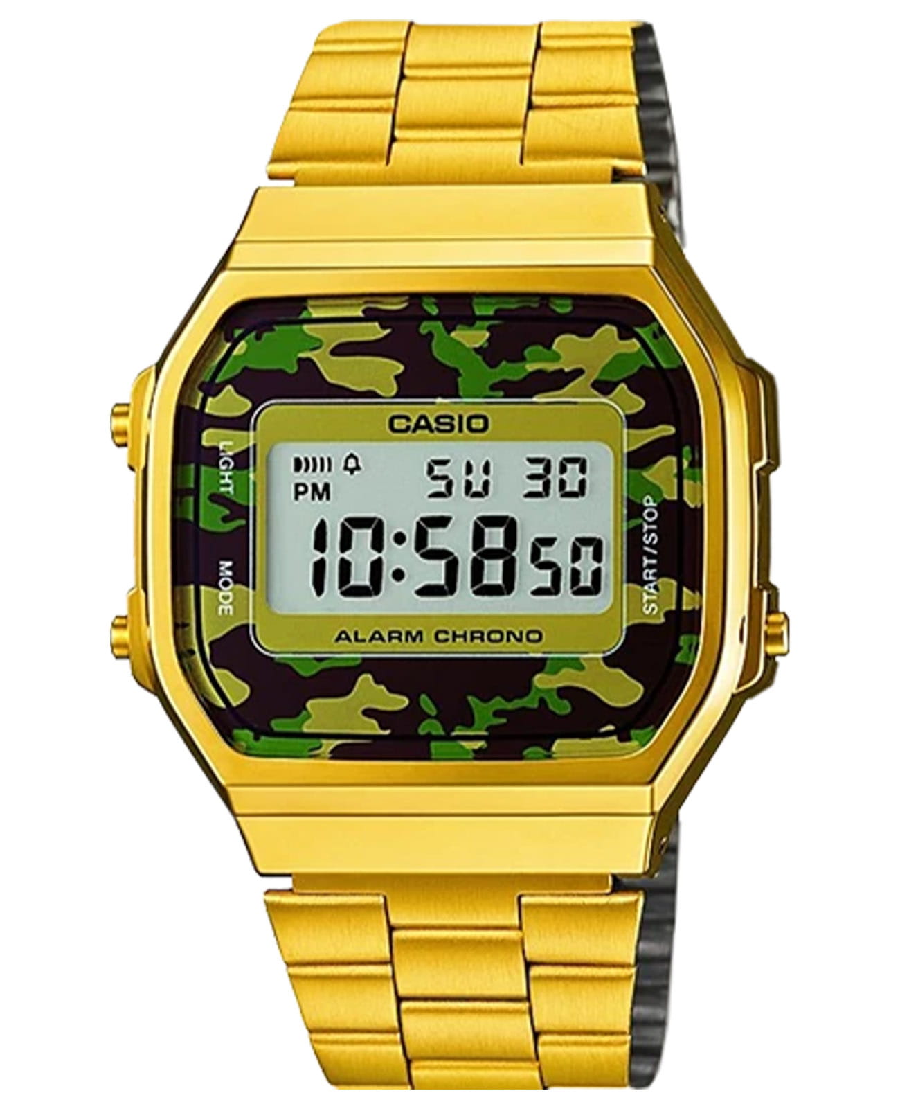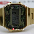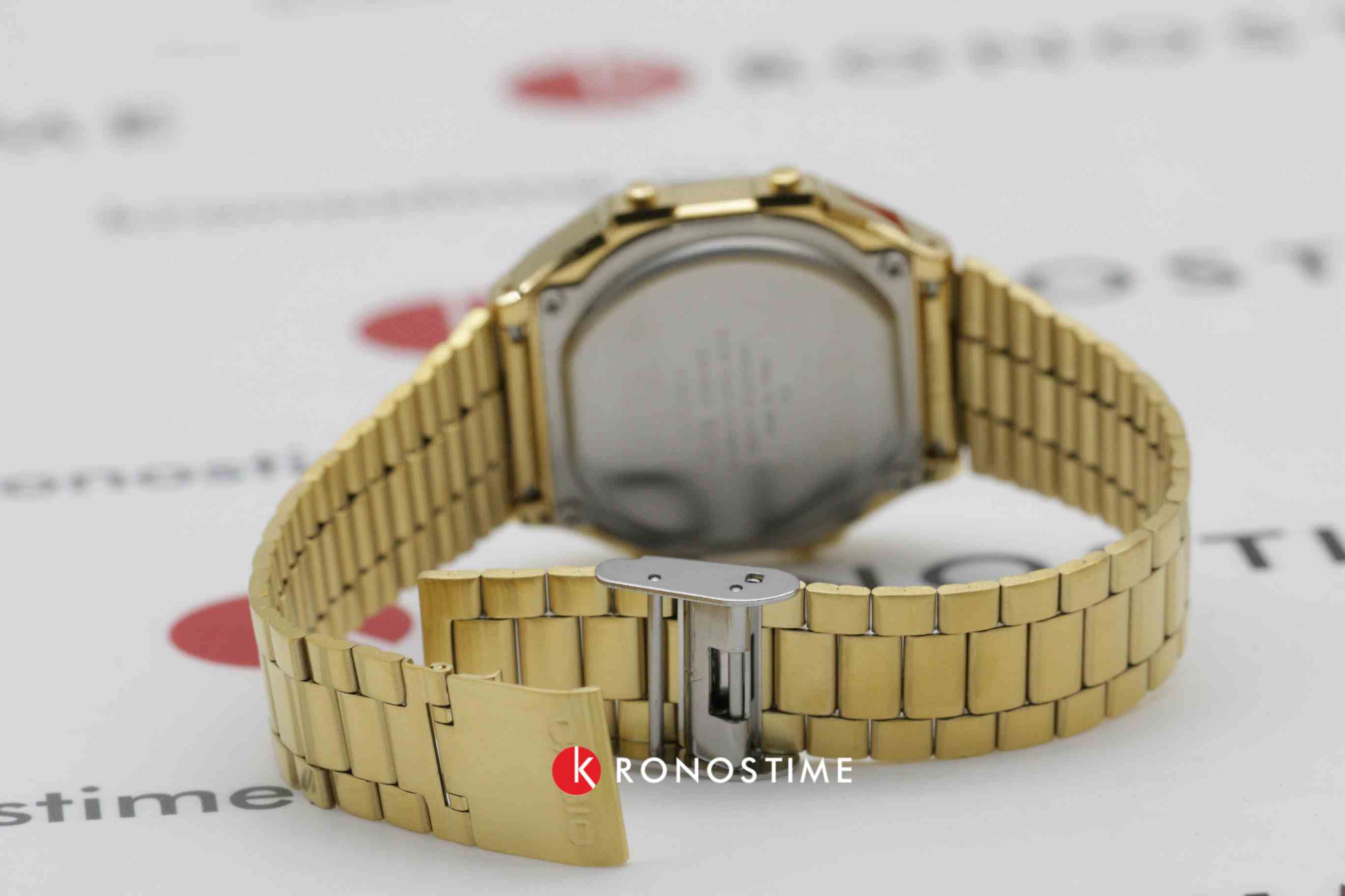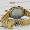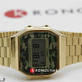 Японские мужские наручные часы с подсветкой. Корпус - Пластиковый; Стекло - Пластик; Водозащита - 30 м. (WR 30); Материал ремешка - Нержавеющая сталь, PVD покрытие; Цвет ремешка - Золотистый; Цвет циферблата - Lcd.