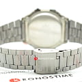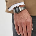 Стильные мужские наручные часы с подсветкой. Корпус - Пластиковый; Стекло - Пластик; Водозащита - 30 м. (WR 30); Материал ремешка - Нержавеющая сталь с iP покрытием; Цвет ремешка - Серый; Цвет циферблата - Lcd.