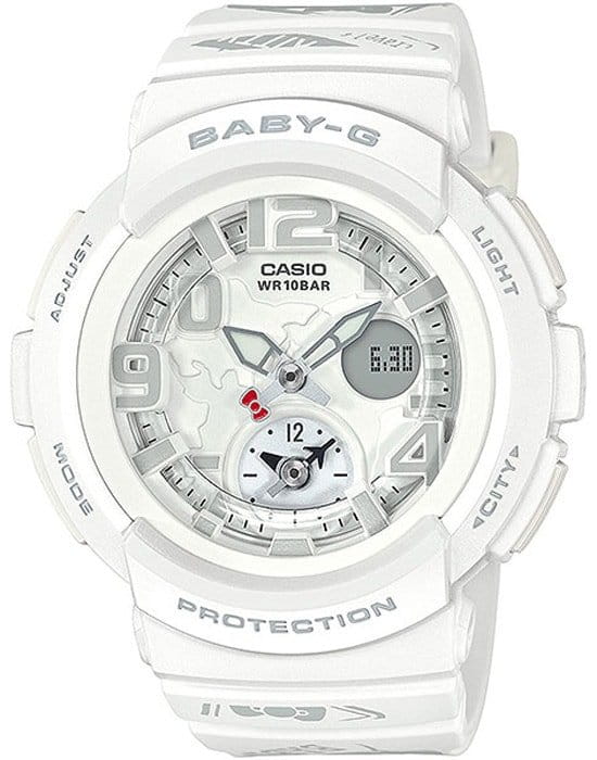 Baby-G Hello Kitty. Лимитированная серия. Циферблат подсвечивается светодиодом. Противоударный корпус защищает механизм от ударов и вибрации. Мировое время – 48 городов (31 часовой пояс), всемирное координированное время (UTC). Автоматический переход на зимнее и летнее время, возможность включения/отключения данной функции. 12-ти и 24-х часовой формат времени. Секундомер с точностью показаний 1с и временем измерения 1ч. Сплит-хронограф. Таймер обратного отсчета от 1мин до 1ч. Функция перемещения стрелок. Функция включения/отключения звука.
