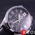 Кварцевый японский механизм Miyota. Точность хода не хуже -10 +15 сек./в месяц. Часы оснащены функцией хронографа, с точностью 1/10с и временем измерения 1ч. Циферблат черного цвета с контрастными элементами дизайна. Стрелки и индексы с светонакопительным нанесением. Корпус выполнен из нержавеющей стали. Ремешок из натуральной кожи черного цвета. Минеральное стекло устойчиво к появлению царапин. Водонепроницаемость 100М. В часах можно плавать. Степень водонепроницаемости не является величиной, эквивалентной функциональной рабочей глубине.