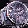 Общее исполнение аксессуара выдержано в автомобильной стилистике, тёмный циферблат отличается оригинальным расположением счётчиков. Наручные часы оснащены технологией BluetoothBluetoothСовременная технология, позволяющая синхронизировать часы с телефоном и переносить данные. Часы с Bluetooth расширяют возможности вашего смартфона и делают его использование ещё более удобным. с низким потреблением энергии, позволяющей часам считывать информацию с интернет-сервера точного времени и обеспечивать абсолютную точность времени. Питание происходит за счёт солнечной батареи - . Водонепроницаемость 100 метров. Минеральное стекло. Люминесцентная подсветкаЛюминесцентное покрытиеПозволяет считывать показания времени в темноте. Производители наносят на стрелки, часовые индексы, безель или поверхность циферблата светонакопительный состав, дающий холодное свечение.. Наличие авиарежима. Функции: уведомление о полученных сообщениях по электронной почте, поиск телефона, отображение числа и дня недели, секундомер, будильник, тахиметрТахиметрРазмеченная шкала, располагается на ободке или безеле часов. Тахиметр позволяет рассчитать скорость на определённом участке пути, расстояние измеряется в километрах или милях., расчёт средней скорости пройденного маршрута. Габариты: 52 x 48,1 x 14,2 мм.