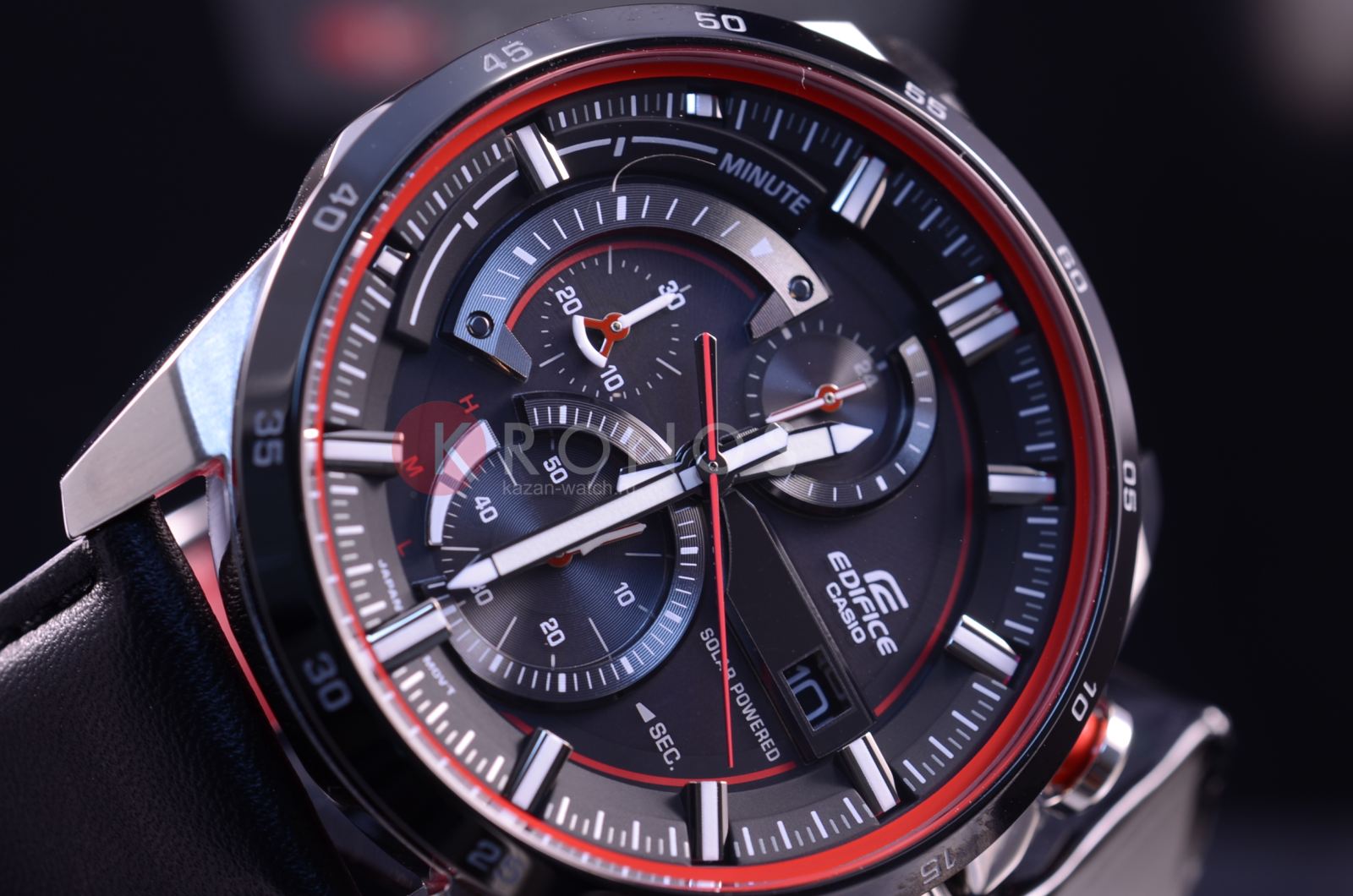 Стильный спортивный хронографХронографФункция позволяет измерять отрезки времени с особой точностью: часы, минуты, секунды. Верным признаком хронографа является наличие на циферблате 3 дополнительных окошек-счётчиков., выдержанный в драйвовой автомобильной тематике, станет ключевой деталью вашего образа. Красные элементы привлекательно смотрятся на чёрном фоне. Наручные часы отличаются ударопрочным корпусомУдаропрочный корпусМеханизм заключён в корпус, выполненный из современных материалов, устойчивых к ударам, механическим повреждениям и падению с высоты: инновационный пластик, карбон, нержавеющая сталь, титан. из антикоррозионной стали 316L. Точность хода японского кварцевого калибра составляет +/- 20 секунд в месяц. Технология питания от солнечного света . Индикатор уровня зарядки аккумулятора. Закручивающаяся задняя крышка. Подсветка NeobriteПодсветка NeobriteИспользование светонакопительных составов на основе сульфида цинка или алюмината стронция, яркий свет можно наблюдать на протяжении 6-10 часов после «зарядки» часов около источника света.. БезельБезельВнешний ободок, закрепляющий стекло. В спортивных часах так называется поворотное кольцо с делениями на циферблате, выполняет роль таймера – замеряет отрезки времени на шкале. Неподвижный безель – элемент декора. Однонаправленно вращающийся безель на дайверских часах позволяет фиксировать моменты погружения и выныривания на поверхность. с IP-покрытиемIP-покрытиеМетод ионного напыления. Демонстрирует повышенную устойчивость к истиранию, окислению и химическим веществам. Под воздействием высокого давления и температуры около 1500°C молекулы металла надёжно соединяются с частицами корпуса часов.. Ремешок из натуральной кожи. Минеральное стекло. Секундомер, отображение числа. Габариты: 52,9 x 49 x 13,2 мм.