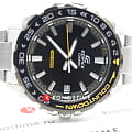 Это отличное решение для современных мужчин, стремящихся выглядеть стильно в любой ситуации. Чёрный циферблат с крупной индикацией времени дополнен яркими акцентами жёлтого цвета, что придаёт общему дополнению динамичность. Прослеживается дайверский характер благодаря однонаправленно вращающемуся фактурному безелюБезельВнешний ободок, закрепляющий стекло. В спортивных часах так называется поворотное кольцо с делениями на циферблате, выполняет роль таймера – замеряет отрезки времени на шкале. Неподвижный безель – элемент декора. Однонаправленно вращающийся безель на дайверских часах позволяет фиксировать моменты погружения и выныривания на поверхность.. И браслет, и ударопрочный корпусУдаропрочный корпусМеханизм заключён в корпус, выполненный из современных материалов, устойчивых к ударам, механическим повреждениям и падению с высоты: инновационный пластик, карбон, нержавеющая сталь, титан. сделаны из стали 316L с противокоррозионными свойствами. Кварцевый японский механизм отличается точностью хода +/- 20 секунд в месяц. Срок службы батарейки - 3 года. Чёрное IP-покрытиеIP-покрытиеМетод ионного напыления. Демонстрирует повышенную устойчивость к истиранию, окислению и химическим веществам. Под воздействием высокого давления и температуры около 1500°C молекулы металла надёжно соединяются с частицами корпуса часов.. Минеральное стекло. Люминесцентная подсветка NeobriteПодсветка NeobriteИспользование светонакопительных составов на основе сульфида цинка или алюмината стронция, яркий свет можно наблюдать на протяжении 6-10 часов после «зарядки» часов около источника света.. Водостойкость 100 метров. Задняя крышка с винтовым фиксатором. Заводная головка с системой защиты. Апертура даты. Габариты: 47,2 x 41 x 10,4 мм.