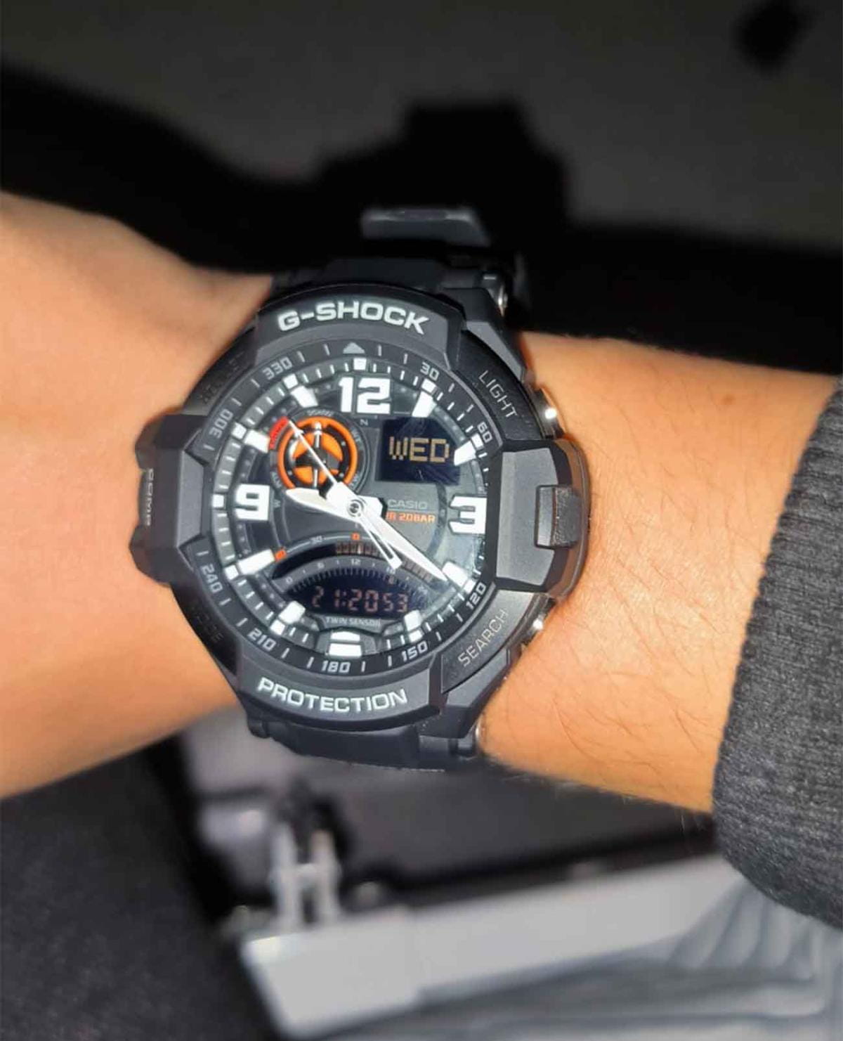 Японские мужские часы-хронографХронографФункция позволяет измерять отрезки времени с особой точностью: часы, минуты, секунды. Верным признаком хронографа является наличие на циферблате 3 дополнительных окошек-счётчиков. Casio G-Shock  G-SHOCK GA-1000-1A из коллекции G-Shock. Минеральное стеклоМинеральное стеклоМинеральное стекло представляет собой искусственно выращенный минерал кварца. Такое стекло отличается особой устойчивостью к повреждениям и царапинам. Уступает по некоторым качествам сапфировому стеклу. устойчивое к появлению царапин, обладающее высокой прозрачностью. Корпус часов изготовлен из полимерного материала. Светонакопительное покрытие NeobriteПодсветка NeobriteИспользование светонакопительных составов на основе сульфида цинка или алюмината стронция, яркий свет можно наблюдать на протяжении 6-10 часов после «зарядки» часов около источника света.. Циферблат подсвечивается подсветкой Neon IlluminatorNeon IlluminatorУникальная подсветка циферблата. На индексы наносятся специальные флуоресцентные чернила, которые подсвечиваются светодиодной подсветкой. ,  благодаря наличию функции задержки, после отпускания кнопки освещение горит еще несколько секунд. Ударопрочный корпусУдаропрочный корпусМеханизм заключён в корпус, выполненный из современных материалов, устойчивых к ударам, механическим повреждениям и падению с высоты: инновационный пластик, карбон, нержавеющая сталь, титан. защищает механизм от ударов и вибрации. Мировое времяМировое время Полезное часовое усложнение, отображающее время в основных городах и известных областях по всему миру, оно связано с часовыми поясами, удобно для путешественников и бизнесменов. – 48 городов (29 часовых поясов). СекундомерСекундомерСекундоме́р — прибор, способный измерять интервалы времени с точностью до долей секунды. с точностью измерения 1/100 секунды и измерением до 23 часов 59 минут 59,99 cек. ТаймерТаймерОтсчитывает секунды в обратном направлении в заданном интервале времени. обратного отсчета (диапазон времени 24 часа), автоматический календарь, 12/24 отображение времени, будильникБудильникБуди́льник — часы, в заданный момент времени подающие звуковой, световой и/или в редких случаях другой сигнал.. Встроенный цифровой компас. Диапазон измерения от 0° до 359° с точностью 1°. Коррекция магнитного склонения. Встроенный датчик температуры от -10° до +60 °. Батарейка рассчитана на 2 года. Стальная задняя крышка крепится на 4-х винтах. Класс водозащиты: 200 метров, позволит плавать, нырять и заниматься другими водными видами спорта. Ремешок из полимерного материала на стандартной застежке.