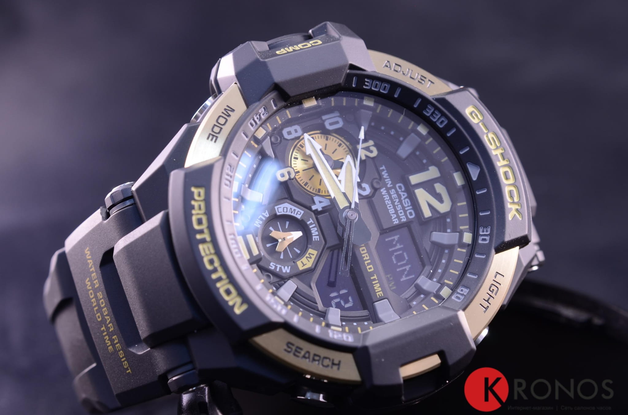 Ударопрочная конструкция защищает от ударов и вибрации.  Светящееся покрытие обеспечивает длительную подсветку в темное время суток после короткого воздействия света.  Встроенный цифровой компас определяет северный магнитный полюс.  Датчик измеряет температуру окружающего воздуха вокруг часов и отображает ее на экране в градусах  °C (-10°C /+60°C). Отображение текущего времени в основных городах и конкретных областях по всему миру. Функция секундомера - 1/100 сек. - 1 час. Таймеры обратного отсчета. Нажатие на кнопку обеспечит перемещение стрелок в такое положение, которое позволит Вам легко считать информацию с маленьких цифровых дисплеев – например, дату или показатели секундомера. Можно отключить звук при нажатии кнопок.  Автоматический календарь. Прочное, устойчивое к царапинам минеральное стекло защищает часы от повреждений. Корпус из нержавеющей стали и полимерного пластика. Ремешок из полимерного материала. Натуральный полимерный материал является идеальным для изготовления ремешка благодаря своей чрезвычайной прочности и гибкости. Водонепроницаемость (20 Бар). Идеально подходит для ныряния без акваланга.