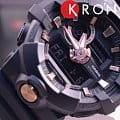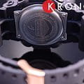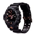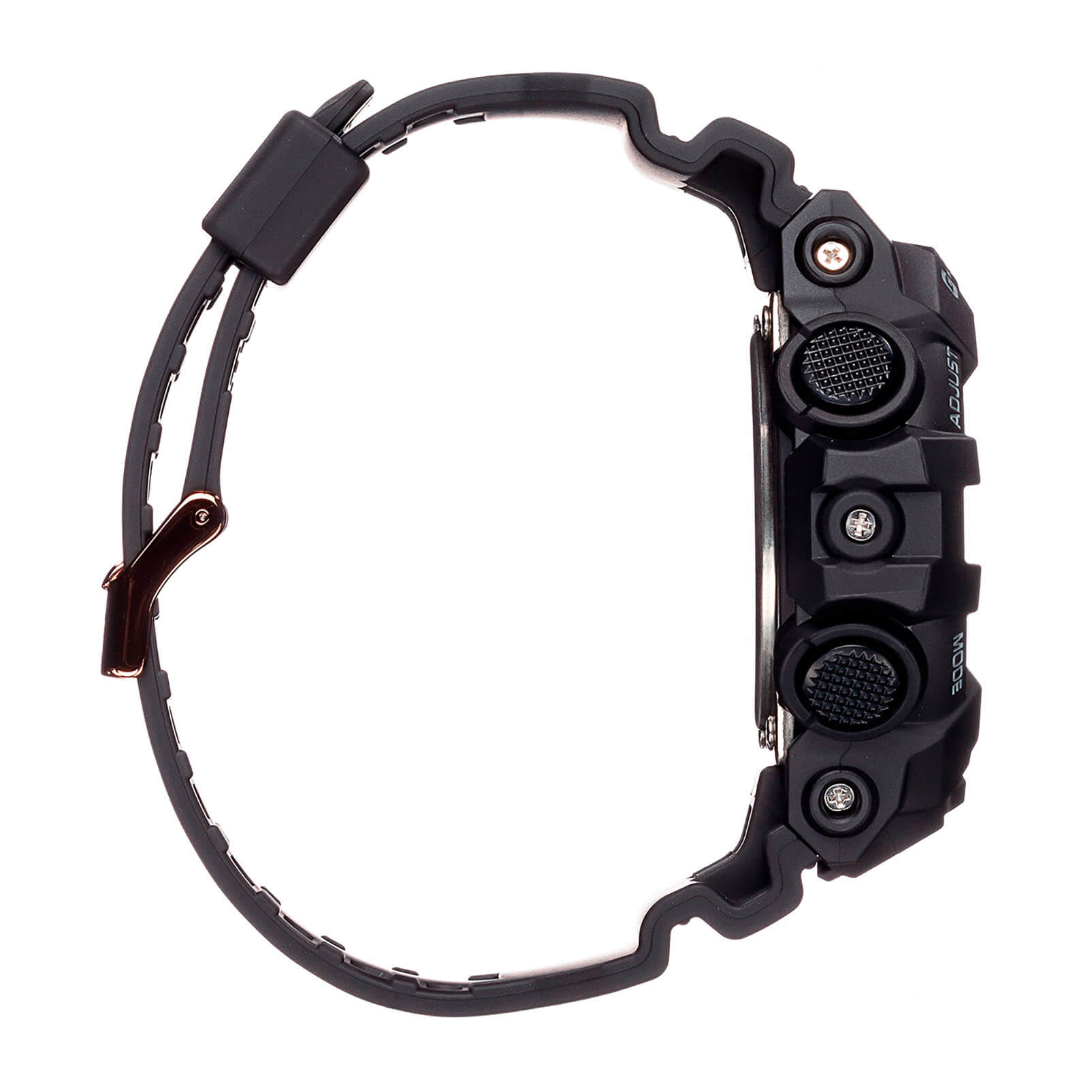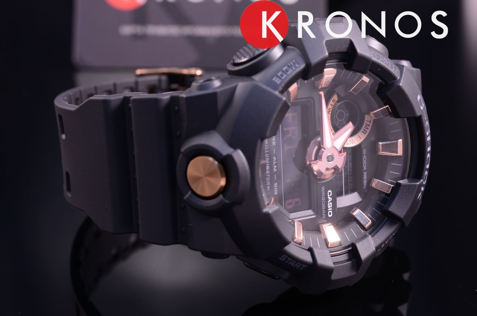 Стильный аксессуар чёрного цвета имеет привлекательные акценты в цвете розового золота, что смягчает его брутальный вид. Часы с крупными стрелками и метками обеспечивают идеальную читаемость показателей времени, кнопка подсветки для удобства вынесена в нижнюю часть ударопрочного корпусаУдаропрочный корпусМеханизм заключён в корпус, выполненный из современных материалов, устойчивых к ударам, механическим повреждениям и падению с высоты: инновационный пластик, карбон, нержавеющая сталь, титан.. Он, как и ремешок, выполнен из полимерного материала, выдерживающим удары и падения. Японский кварцевый механизм получает питание от батарейки, отличающейся повышенным сроком службы до 5 лет. Закаленное минеральное стекло. Яркая светодиодная подсветкаСветодиодная подсветкаСветодиодная или LED-подсветка обеспечивает появление яркого холодного свечения за счёт LED-элементов - маленьких лампочек. Они потребляют минимальное количество энергии, чаще всего можно встретить 1 светодиод, в нижней части циферблата.. Водозащита 200 метров. Функция перемещения стрелок для быстрого доступа к данным малых счётчиков. Таймер обратного отсчёта, UTCUTCВсемирное кординационное время, не имеющее привязки к географическому положению Гринвича, основывается на атомном отсчёте времени. Регулировка времени осуществляется более точно, чем устаревшее GMT.