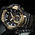 Наручные часы являются представителем линейки Gravitymaster, дисплей чем-то напоминает кабину пассажирского самолёта. Особенностью аксессуара стал цифровой дисплей с самым высоким разрешением среди G-Shock, что появилось за счёт внедрения технологии STN. Это позволило добиться широкоугольного обзора и улучшить читаемость циферблата. Также интерес привлекает модифицированный таймер, где можно установить число, месяц или год, планируемому событию для удобства можно дать название. Противоударный корпусУдаропрочный корпусМеханизм заключён в корпус, выполненный из современных материалов, устойчивых к ударам, механическим повреждениям и падению с высоты: инновационный пластик, карбон, нержавеющая сталь, титан. выполнен из полимерного материала, японский кварцевый механизм с точностью хода +/- 15 секунд в месяц находится под надёжной защитой. безельБезельВнешний ободок, закрепляющий стекло. В спортивных часах так называется поворотное кольцо с делениями на циферблате, выполняет роль таймера – замеряет отрезки времени на шкале. Неподвижный безель – элемент декора. Однонаправленно вращающийся безель на дайверских часах позволяет фиксировать моменты погружения и выныривания на поверхность. из стали 316L c золотистым IP-покрытиемIP-покрытиеМетод ионного напыления. Демонстрирует повышенную устойчивость к истиранию, окислению и химическим веществам. Под воздействием высокого давления и температуры около 1500°C молекулы металла надёжно соединяются с частицами корпуса часов.. Технология . Индикатор заряда аккумулятора. Закаленное минеральное стекло. Синхронизация со смартфоном Bluetooth 4.0BluetoothСовременная технология, позволяющая синхронизировать часы с телефоном и переносить данные. Часы с Bluetooth расширяют возможности вашего смартфона и делают его использование ещё более удобным.. Водозащита 20 бар. СветодиоднаяСветодиодная подсветкаСветодиодная или LED-подсветка обеспечивает появление яркого холодного свечения за счёт LED-элементов - маленьких лампочек. Они потребляют минимальное количество энергии, чаще всего можно встретить 1 светодиод, в нижней части циферблата. и люминесцентнаяЛюминесцентное покрытиеПозволяет считывать показания времени в темноте. Производители наносят на стрелки, часовые индексы, безель или поверхность циферблата светонакопительный состав, дающий холодное свечение. подсветка. Возможности: поиск телефона, секундомер, будильник, хронографХронографФункция позволяет измерять отрезки времени с особой точностью: часы, минуты, секунды. Верным признаком хронографа является наличие на циферблате 3 дополнительных окошек-счётчиков., автоматический календарь до 2099 года, мировое времяМировое время Полезное часовое усложнение, отображающее время в основных городах и известных областях по всему миру, оно связано с часовыми поясами, удобно для путешественников и бизнесменов. , UTCUTCВсемирное кординационное время, не имеющее привязки к географическому положению Гринвича, основывается на атомном отсчёте времени. Регулировка времени осуществляется более точно, чем устаревшее GMT.