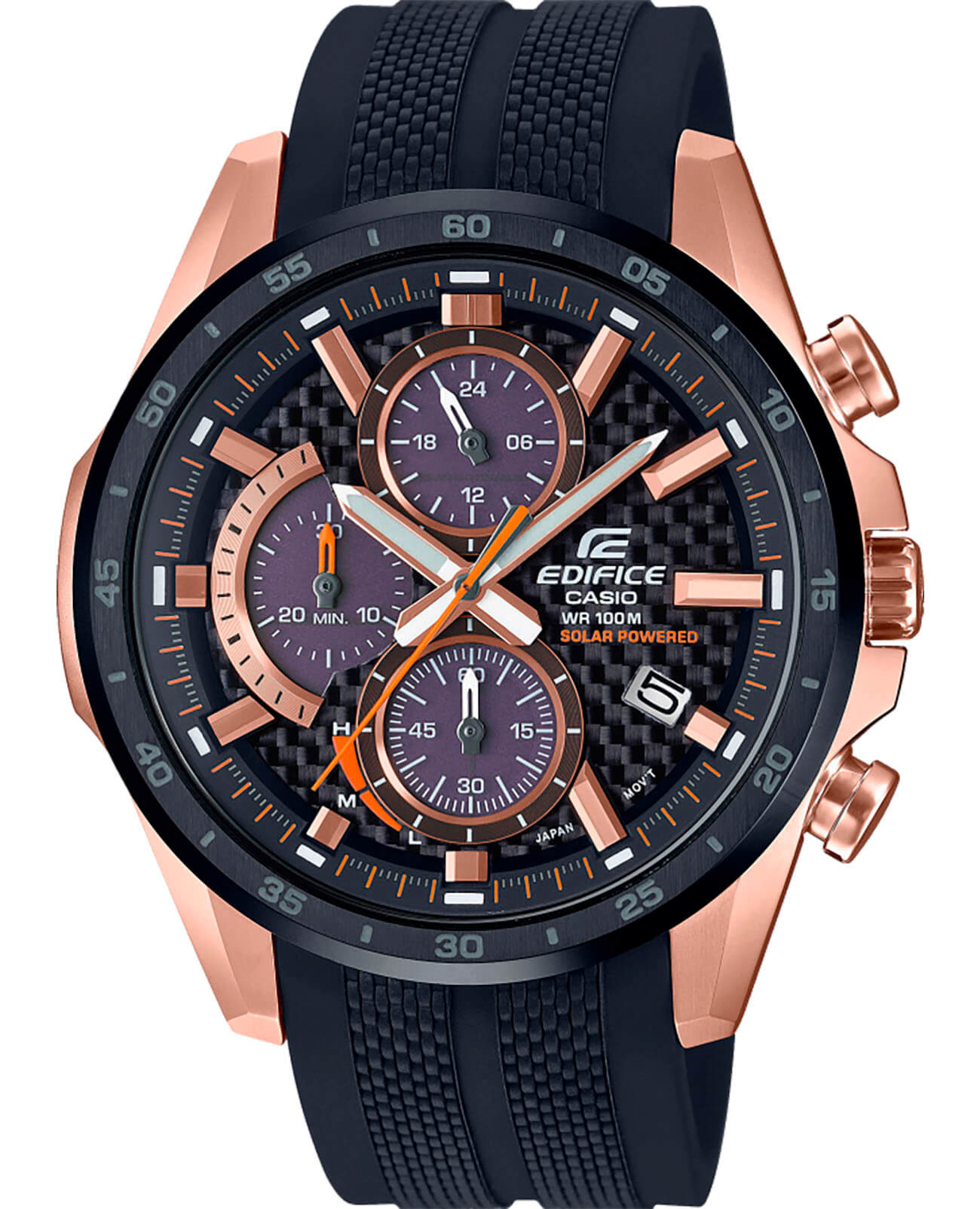 Модель как воплощение спортивной динамики имеет характерные дизайнерские элементы оформления: текстурированный карбоновый циферблат, крупные счётчики, надёжный каучуковый ремешок чёрного цвета. Наручные часы работают за счёт технологии , получая энергию от солнечного света. Индикатор уровня заряда элемента питания позволяет следить за необходимостью подзарядить аккумулятор. Ударопрочный корпусУдаропрочный корпусМеханизм заключён в корпус, выполненный из современных материалов, устойчивых к ударам, механическим повреждениям и падению с высоты: инновационный пластик, карбон, нержавеющая сталь, титан. из нержавеющей стали 316L с ионным IP-покрытиемIP-покрытиеМетод ионного напыления. Демонстрирует повышенную устойчивость к истиранию, окислению и химическим веществам. Под воздействием высокого давления и температуры около 1500°C молекулы металла надёжно соединяются с частицами корпуса часов.. Минеральное стекло. Люминесцентная подсветкаЛюминесцентное покрытиеПозволяет считывать показания времени в темноте. Производители наносят на стрелки, часовые индексы, безель или поверхность циферблата светонакопительный состав, дающий холодное свечение.. Завинчивающаяся задняя крышка. Водонепроницаемость 10 бар. Отображение даты, секундомер. Габариты: 51,5 x 47,6 x 12 мм.