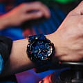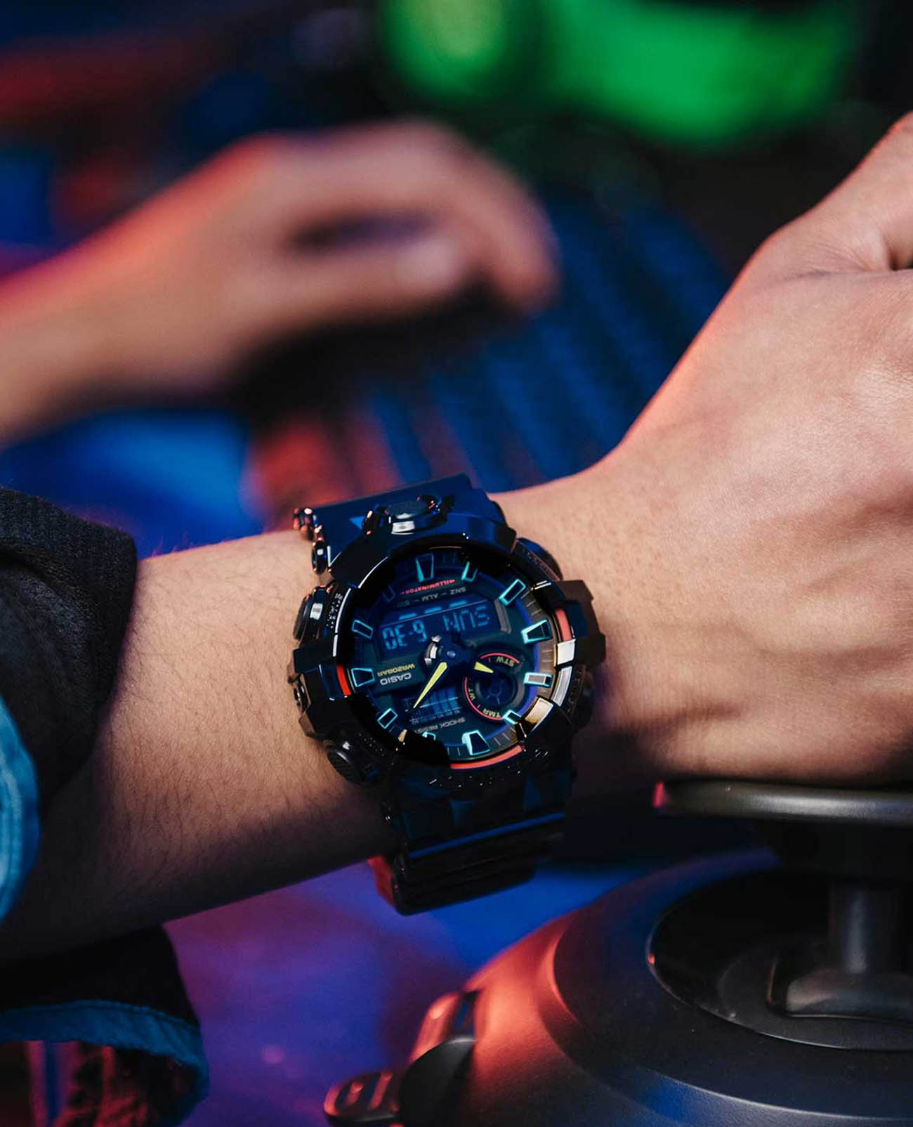 Японские мужские часы-хронографХронографФункция позволяет измерять отрезки времени с особой точностью: часы, минуты, секунды. Верным признаком хронографа является наличие на циферблате 3 дополнительных окошек-счётчиков. Casio G-Shock G-SHOCK GA-700RGB-1ADR из коллекции G-Shock. Минеральное стеклоМинеральное стеклоМинеральное стекло представляет собой искусственно выращенный минерал кварца. Такое стекло отличается особой устойчивостью к повреждениям и царапинам. Уступает по некоторым качествам сапфировому стеклу. устойчивое к появлению царапин, обладающее высокой прозрачностью. Корпус часов изготовлен из полимерного материала. Циферблат подсвечивается светодиодом, функция автоподсветки освещает циферблат при повороте часов к лицу. Ударопрочный корпусУдаропрочный корпусМеханизм заключён в корпус, выполненный из современных материалов, устойчивых к ударам, механическим повреждениям и падению с высоты: инновационный пластик, карбон, нержавеющая сталь, титан. защищает механизм от ударов и вибрации. Мировое времяМировое время Полезное часовое усложнение, отображающее время в основных городах и известных областях по всему миру, оно связано с часовыми поясами, удобно для путешественников и бизнесменов. – 48 городов (29 часовых поясов). СекундомерСекундомерСекундоме́р — прибор, способный измерять интервалы времени с точностью до долей секунды. с точностью измерения 1/100 секунды и измерением до 23 часов 59 минут 59,99 cек. ТаймерТаймерОтсчитывает секунды в обратном направлении в заданном интервале времени. обратного отсчета (диапазон времени 24 часа), автоматический календарь, 12/24 отображение времени. 5будильниковБудильникБуди́льник — часы, в заданный момент времени подающие звуковой, световой и/или в редких случаях другой сигнал., один с функцией Snooze, ежечасный сигнал. Стальная задняя крышка крепится на 4-х винтах. Класс водозащиты: 200 метров, позволит плавать, нырять и заниматься другими водными видами спорта. Ремешок из полимерного материала на стандартной застежке.