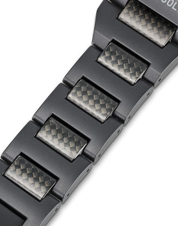 Монолитный карбоновый корпус. Выпуклое сапфировое стекло с антибликовым покрытием. Ремешок часов из армированной углеродом смолы  с механизмом удлинения на пряжке для ношения часов поверх гидрокостюма во время погружения.