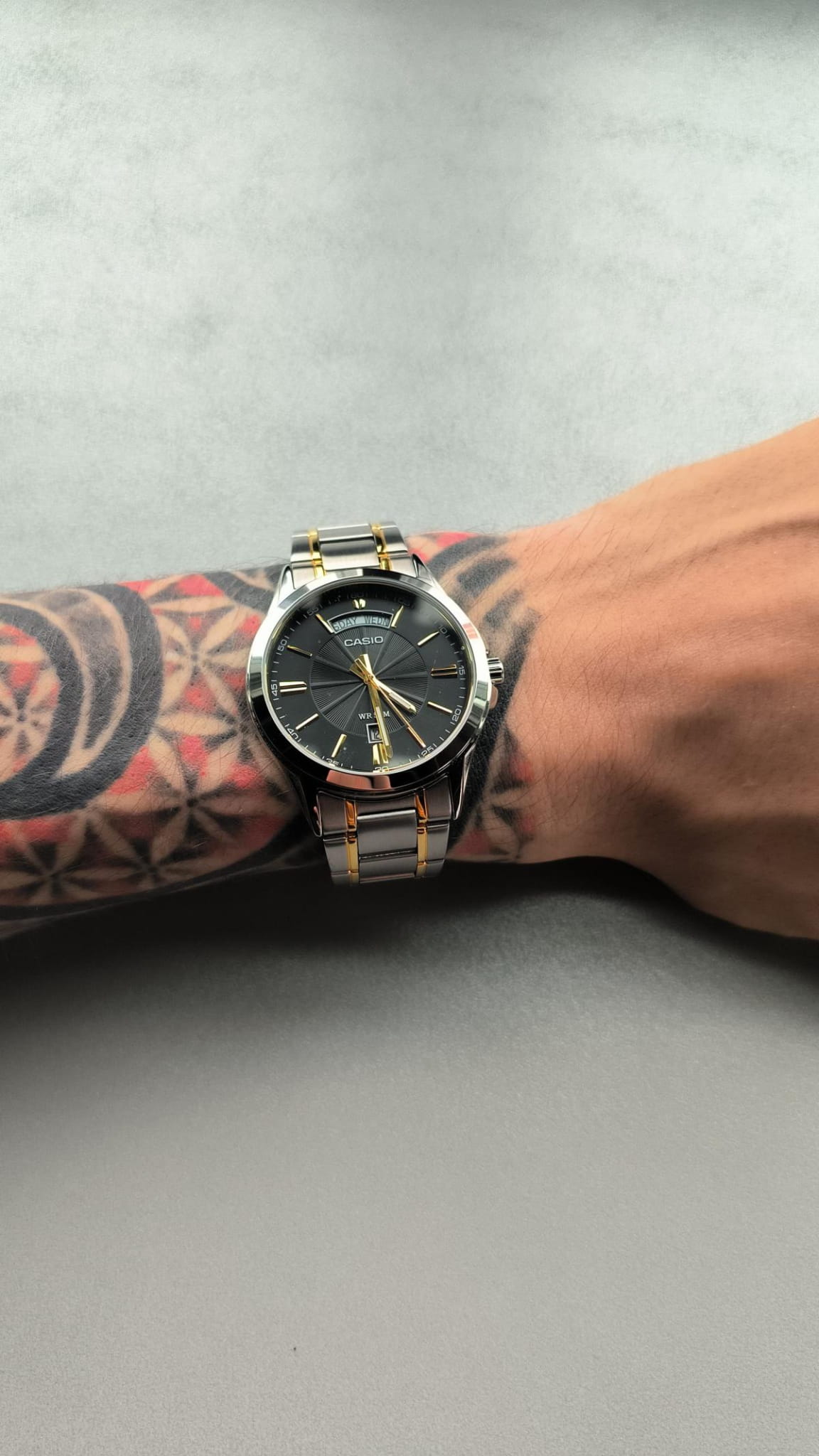 Японские мужские наручные часы с минеральным стекломМинеральное стеклоМинеральное стекло представляет собой искусственно выращенный минерал кварца. Такое стекло отличается особой устойчивостью к повреждениям и царапинам. Уступает по некоторым качествам сапфировому стеклу. Casio MTP-1381G-1A, кварцевый механизм с высокой точностью. Класс водозащиты: 50 метров, позволит защитить корпус от случайных брызг или капель дождя. Корпус часов изготовлен из стали. Стальной браслет на раскладной застёжкеРаскладная застёжкаТакой тип застёжки используется только на браслетах из металла. Она никогда не раскрывается полностью, происходит разделение на 2 и более частей. Раскладывающая застёжка снизит вероятность потери часов к минимуму. с IP-покрытиемIP-покрытиеМетод ионного напыления. Демонстрирует повышенную устойчивость к истиранию, окислению и химическим веществам. Под воздействием высокого давления и температуры около 1500°C молекулы металла надёжно соединяются с частицами корпуса часов.. Окошко даты находится в положении 6 часов.