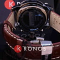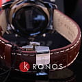 Элегантный хронографХронографФункция позволяет измерять отрезки времени с особой точностью: часы, минуты, секунды. Верным признаком хронографа является наличие на циферблате 3 дополнительных окошек-счётчиков. с коричневым ремешком из натуральной кожи идеально завершит образ делового мужчины. Швейцарский кварцевый калибр ETA G10.211 измеряет время с высокой точностью хода. Стрелки имеют люминесцентное покрытиеЛюминесцентное покрытиеПозволяет считывать показания времени в темноте. Производители наносят на стрелки, часовые индексы, безель или поверхность циферблата светонакопительный состав, дающий холодное свечение.. Функции: секундомер, EOLEOLПредставляет собой систему, уведомляющую владельца часов о необходимости замены элемента питания. За 2 недели до полного разряда батарейки секундная стрелка перестаёт ходить чётко и начинает перепрыгивать на 3-4 деления., дата, тахиметрТахиметрРазмеченная шкала, располагается на ободке или безеле часов. Тахиметр позволяет рассчитать скорость на определённом участке пути, расстояние измеряется в километрах или милях..