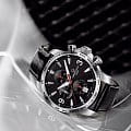 Брендовый аксессуар показывает время с абсолютной точностью благодаря швейцарскому автоматическому механизму ETA C01.211 с запасом хода на 40 часов. Ремешок выполнен из натуральной кожи, для изготовления корпуса выбрали сталь 316L. Стрелки и метки дополнены люминесцентной подсветкойЛюминесцентное покрытиеПозволяет считывать показания времени в темноте. Производители наносят на стрелки, часовые индексы, безель или поверхность циферблата светонакопительный состав, дающий холодное свечение.. Функции: секундомер, календарь, тахиметрТахиметрРазмеченная шкала, располагается на ободке или безеле часов. Тахиметр позволяет рассчитать скорость на определённом участке пути, расстояние измеряется в километрах или милях..