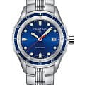 Швейцарский кварцевый механизм ETA 955.112 измеряет время с особой точностью хода. Антибликовое покрытие сапфирового стекла улучшает читаемость синего циферблата. Стрелки и метки имеют люминесцентную подсветкуЛюминесцентное покрытиеПозволяет считывать показания времени в темноте. Производители наносят на стрелки, часовые индексы, безель или поверхность циферблата светонакопительный состав, дающий холодное свечение.. Водостойкость WR 100. Отображение числа.