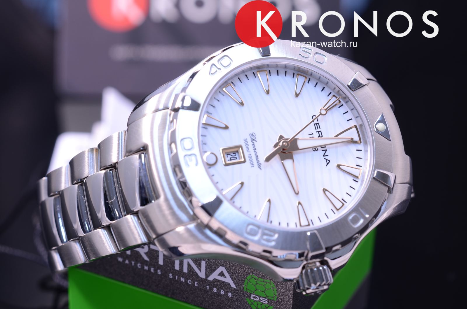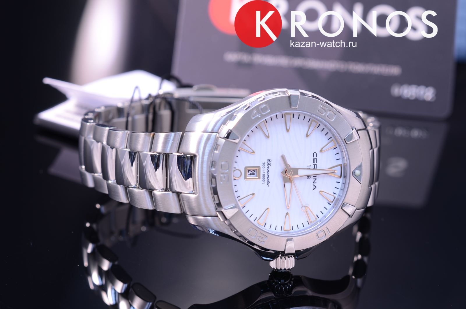 Компактный циферблат дополнен золотистыми деталями и привлекательным волновым узором, что стало выражением любви бренда к водной тематике. Отражением морского характера стал вращающийся безельБезельВнешний ободок, закрепляющий стекло. В спортивных часах так называется поворотное кольцо с делениями на циферблате, выполняет роль таймера – замеряет отрезки времени на шкале. Неподвижный безель – элемент декора. Однонаправленно вращающийся безель на дайверских часах позволяет фиксировать моменты погружения и выныривания на поверхность., водостойкость WR 300, завинчивающаяся заводная головка и задняя крышка. Высокая точность хода швейцарского кварцевого калибра F04.411 Precidrive™Precidrive™Инновационный кварцевый механизм Certina. Часы, оснащённые этим швейцарским калибром, приравниваются к точности к сертифицированным хронометрам, точность хода составляет +/-10 секунд в год. стала весомым основанием для получения сертификата хронометра COSCСертификат COSCОфициальный сертификат, подтверждающий то, что часы ходят с особо высокой точностью. Для получения документа часы подвергаются тестовым испытаниям, разработанным швейцарским институтом тестирования хронометров COSC. Допустимая норма для механических часов -4/+6 секунд в день, для кварцевых моделей +/- 0,07 секунд в день.. Система DS ConceptDS ConceptDouble Security Concept, обозначает двойную надёжность и безупречную точность часов Certina. Двойная система защиты подразумевает обеспечение максимальной устойчивости к ударам и высоких показателей водонепроницаемости.. Стальной ударопрочный корпусУдаропрочный корпусМеханизм заключён в корпус, выполненный из современных материалов, устойчивых к ударам, механическим повреждениям и падению с высоты: инновационный пластик, карбон, нержавеющая сталь, титан. и браслет. Сапфировое стекло с покрытием «антиблик». Индикатор EOLEOLПредставляет собой систему, уведомляющую владельца часов о необходимости замены элемента питания. За 2 недели до полного разряда батарейки секундная стрелка перестаёт ходить чётко и начинает перепрыгивать на 3-4 деления., отображение числа. Диаметр корпуса: 34 мм.