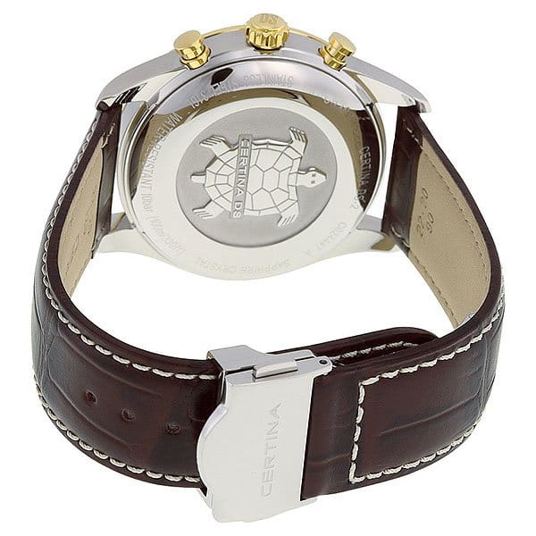 Стальной корпус оснащён алюминиевым безелемБезельВнешний ободок, закрепляющий стекло. В спортивных часах так называется поворотное кольцо с делениями на циферблате, выполняет роль таймера – замеряет отрезки времени на шкале. Неподвижный безель – элемент декора. Однонаправленно вращающийся безель на дайверских часах позволяет фиксировать моменты погружения и выныривания на поверхность.. Швейцарский кварцевый калибр ETA 251.264 Precidrive™Precidrive™Инновационный кварцевый механизм Certina. Часы, оснащённые этим швейцарским калибром, приравниваются к точности к сертифицированным хронометрам, точность хода составляет +/-10 секунд в год., способствует работе секундомера, измеряющего время с точностью до 1/100 секунды. Функции: хронографХронографФункция позволяет измерять отрезки времени с особой точностью: часы, минуты, секунды. Верным признаком хронографа является наличие на циферблате 3 дополнительных окошек-счётчиков., дата, EOLEOLПредставляет собой систему, уведомляющую владельца часов о необходимости замены элемента питания. За 2 недели до полного разряда батарейки секундная стрелка перестаёт ходить чётко и начинает перепрыгивать на 3-4 деления.. Ремешок сделан из натуральной кожи.