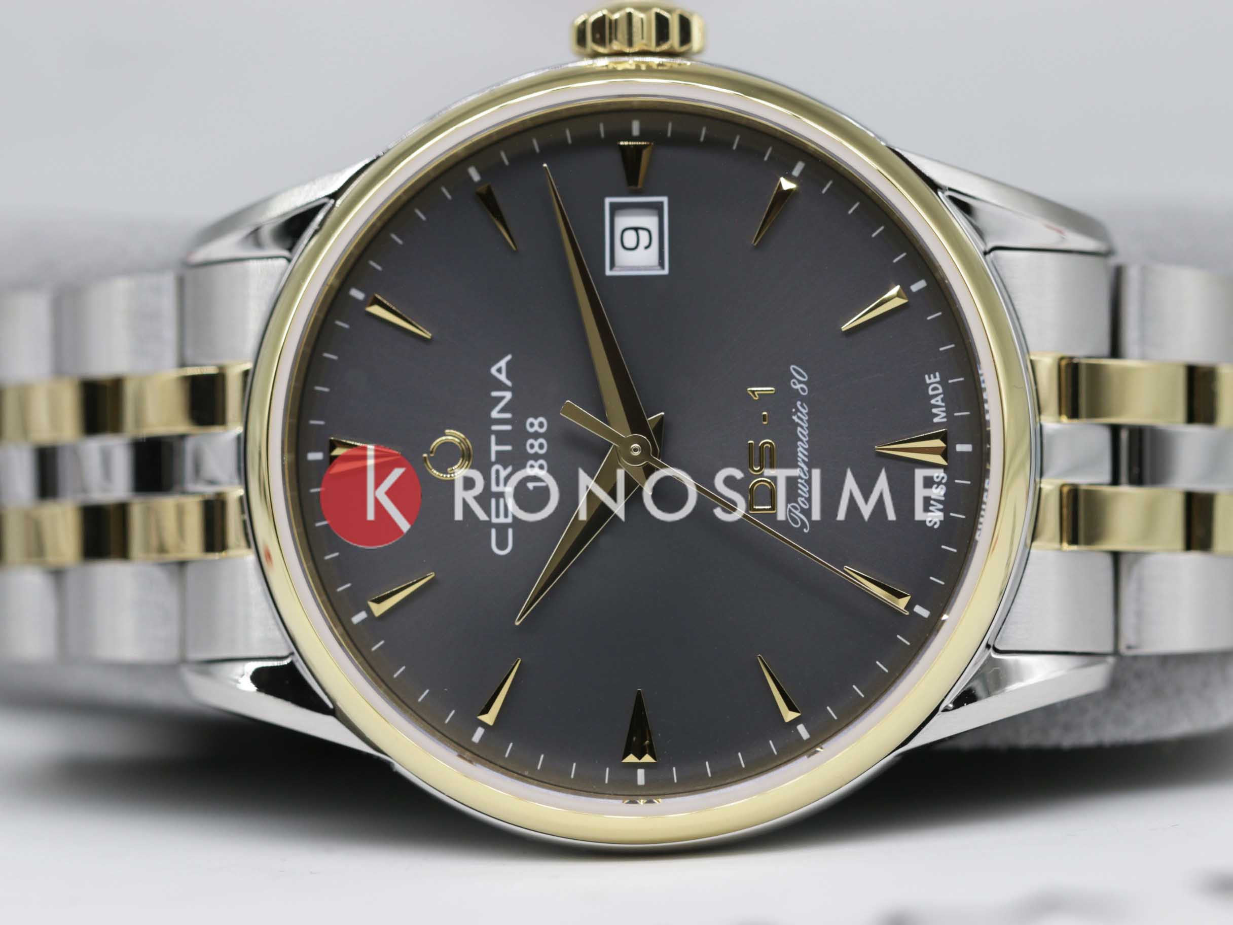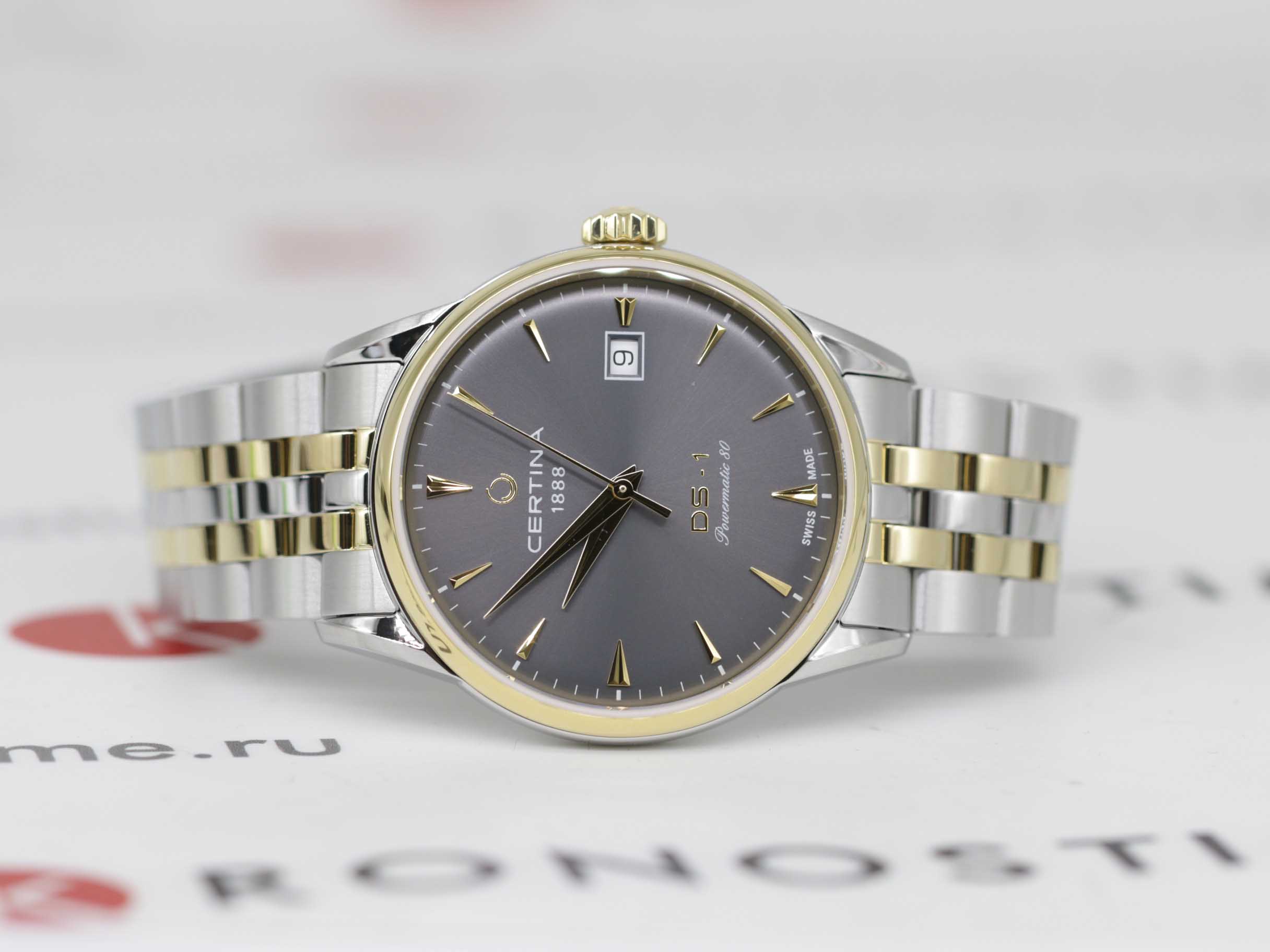 Certina DS-1 Powermatic 80 (C029.207.22.081.00) — элегантные швейцарские часы, сочетающие классический дизайн и современные технологии. Корпус выполнен из нержавеющей стали 316L диаметром 38 мм с PVDPVDУльтратонкое покрытие наносится в технике вакуумного напыления, сочетает в себе нитрид титана особой прочности со слоем золота или оксида хрома. Несёт в себе декоративную или защитную функцию.-покрытием золотого цвета на безелеБезельВнешний ободок, закрепляющий стекло. В спортивных часах так называется поворотное кольцо с делениями на циферблате, выполняет роль таймера – замеряет отрезки времени на шкале. Неподвижный безель – элемент декора. Однонаправленно вращающийся безель на дайверских часах позволяет фиксировать моменты погружения и выныривания на поверхность., придающим модели изысканный двухцветный вид. Сапфировое стеклоСапфировое стеклоПрочный и надёжный материал из кристалла сапфира синтетического происхождения, характеризующийся особой твёрдостью и устойчивостью к царапинам и повреждениям. с антибликовым покрытиемАнтибликовое покрытиеСлой оксида металла в 0,13-0,3 микрон, благодаря которому стекло часов не бликует и не отражает свет. Антибликовое покрытие уменьшает отражение света в 10 раз, обеспечивая отличную читаемость показателей циферблата. защищает циферблат от царапин и гарантирует превосходную читаемость. Механизм Powermatic 80Powermatic 80Эксклюзивный калибр от швейцарской компании ETA с увеличенным запасом хода до 80 часов за счёт удлинённой заводной пружины. Характеризуется улучшенной системой спуска со сниженным трением. с 80-часовым запасом хода и спиралью баланса Nivachron™Nivachron™Специально разработанный инновационный сплав Nivachron™ повышает устойчивость часов к воздействию магнитных полей. обеспечивает высокую точность и устойчивость к магнитным полям. Серый циферблат с солнечным узором оснащён стрелками и метками с люминесцентным покрытиемЛюминесцентное покрытиеПозволяет считывать показания времени в темноте. Производители наносят на стрелки, часовые индексы, безель или поверхность циферблата светонакопительный состав, дающий холодное свечение., обеспечивающим удобное считывание времени в условиях низкой освещённости. Браслет из нержавеющей стали 316L с PVDPVDУльтратонкое покрытие наносится в технике вакуумного напыления, сочетает в себе нитрид титана особой прочности со слоем золота или оксида хрома. Несёт в себе декоративную или защитную функцию.-покрытием золотого цвета на застёжке-бабочке с кнопкамиЗастёжка "бабочка"Такой вид застёжки дополняется предохранителями, помогающими избежать случайного раскрытия браслета. Обладают изящным исполнением. с двумя кнопками для надёжной фиксации. Водонепроницаемость 100 метров делает модель подходящей для плавания и других водных активностей.