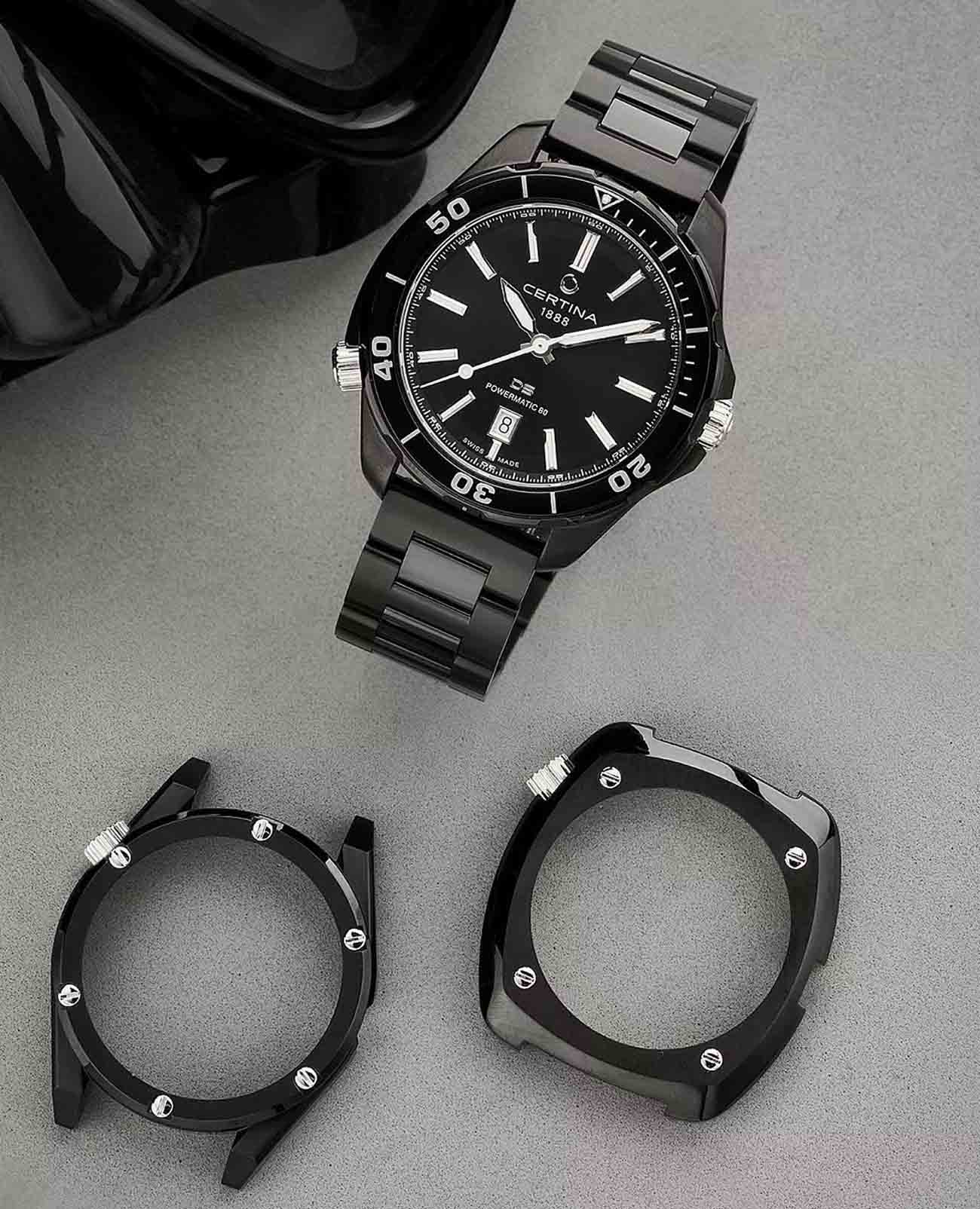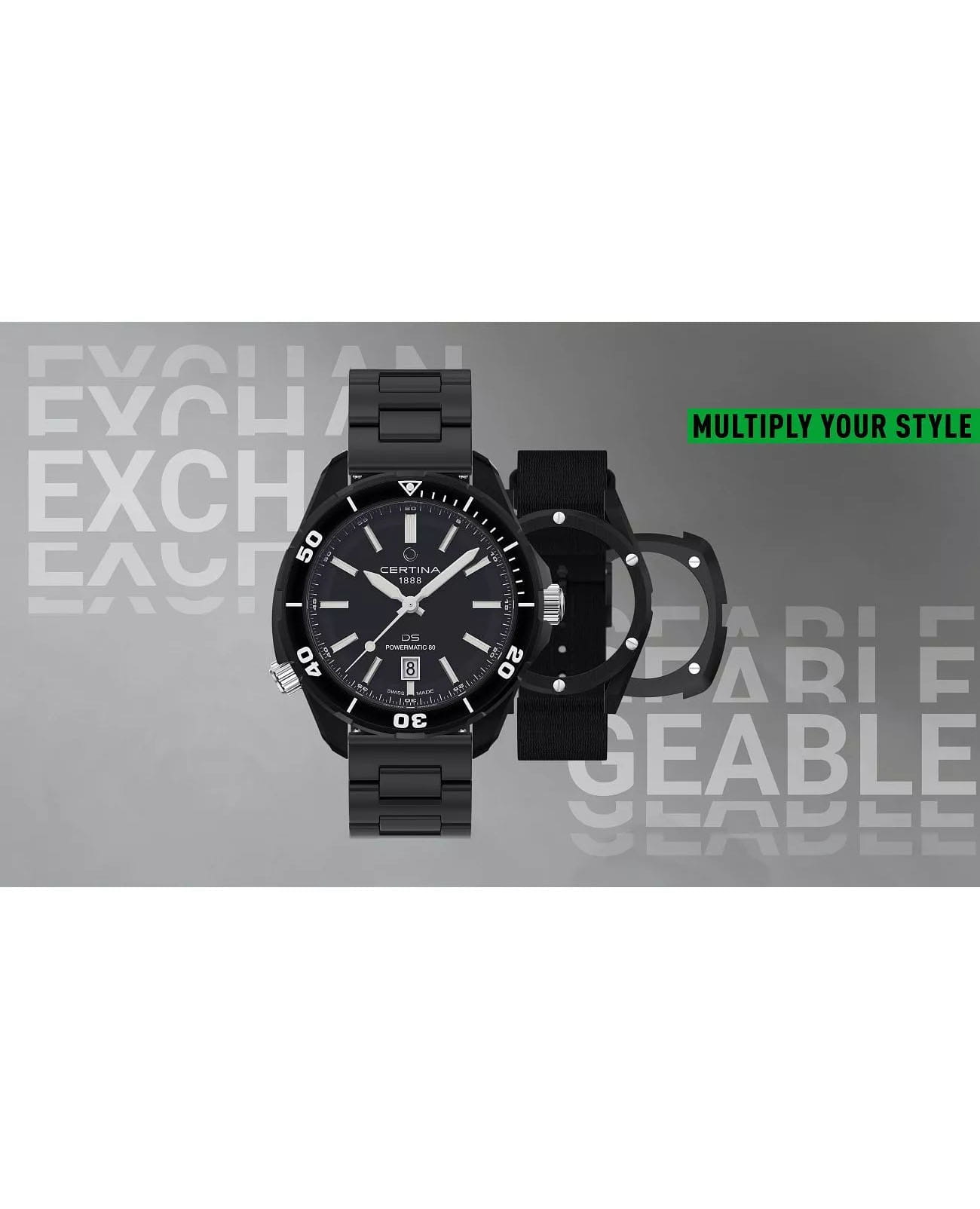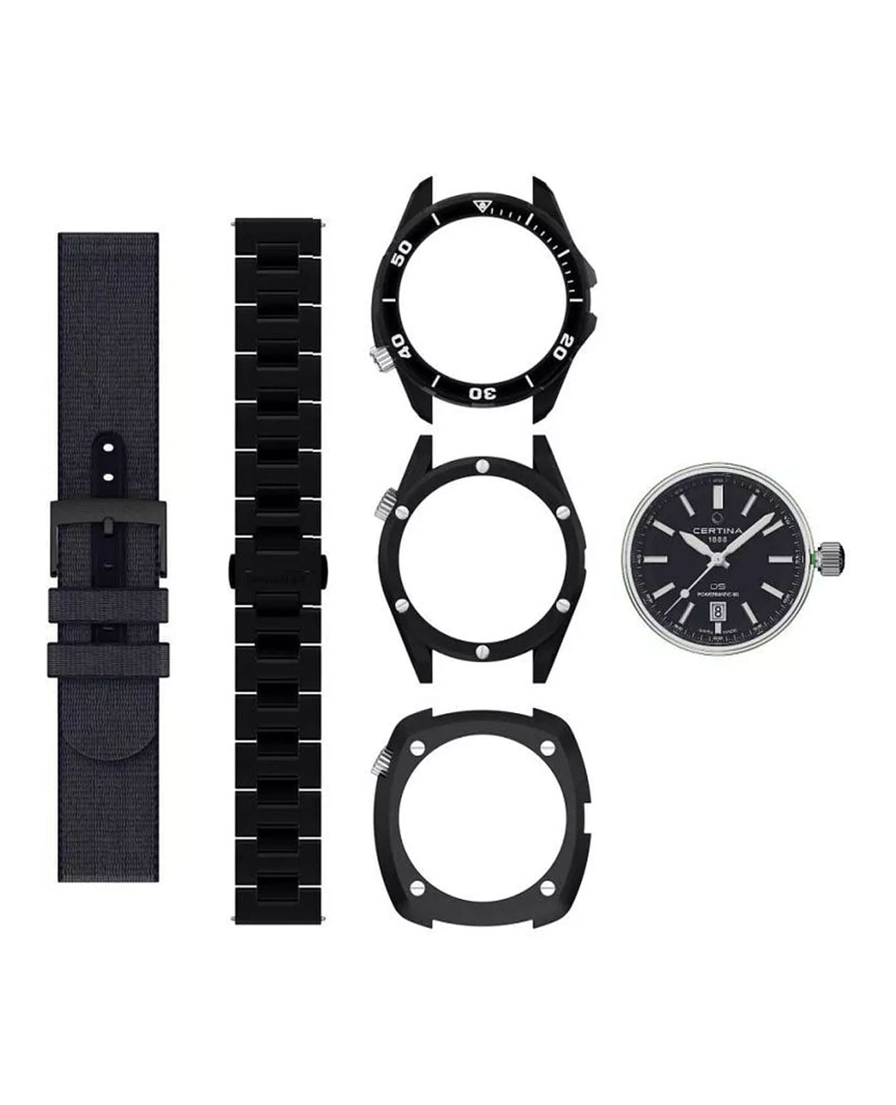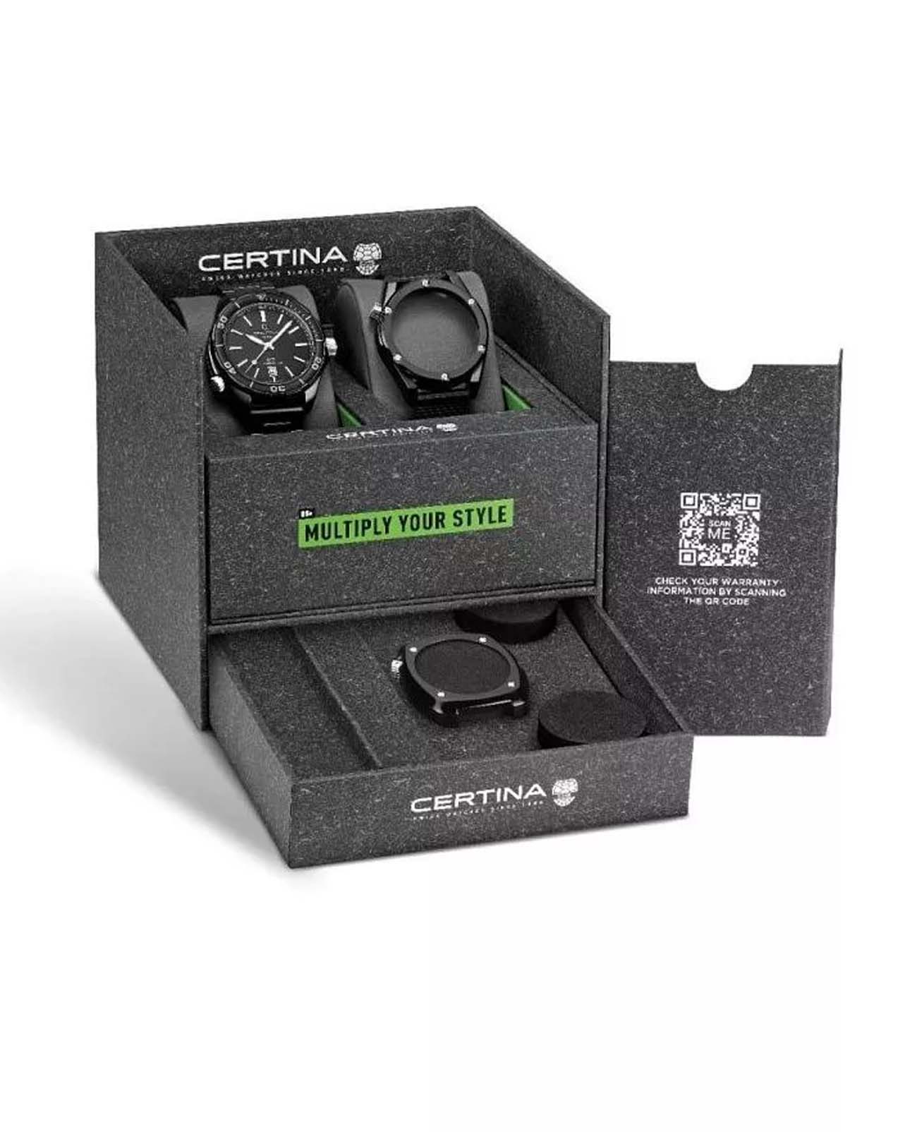 Мужские швейцарские модульные часы Certina DS+ C041.407.39.051.00. Модель DS+ представляет новую концепцию от Certina: часы с возможностью выбора не только ремешка, но и формы корпуса для создания кастомизированного аксессуара. Секрет DS+ заключается в конструкции, состоящей из трех частей: модуля механизма с циферблатом, корпуса и ремешка. Каждый из трех элементов представляет собой самостоятельную единицу. Модуль механизма круглой формы комбинируется с корпусами из нержавеющей стали и надежно закрепляется с помощью заводной головки на корпусе. Инновационная прокладка из биоматериала обеспечивает идеальное уплотнение. Ушки, расположенные на корпусе, позволяют использовать систему быстрой замены Certina для крепления выбранного ремешка. Современный механизм PowermaticPowermatic 80Эксклюзивный калибр от швейцарской компании ETA с увеличенным запасом хода до 80 часов за счёт удлинённой заводной пружины. Характеризуется улучшенной системой спуска со сниженным трением. с 80-часовым запасом хода и пружиной баланса NivachronTM. Наряду с часовой, минутной и секундной стрелками часы имеют окошко даты на отметке «6 часов». Стрелки и метки с люминесцентным покрытиемЛюминесцентное покрытиеПозволяет считывать показания времени в темноте. Производители наносят на стрелки, часовые индексы, безель или поверхность циферблата светонакопительный состав, дающий холодное свечение.. Благодаря сверхпрочной конструкции с завинчивающейся задней крышкой и завинчивающейся заводной головкой, часы обладают водонепроницаемостью до 20 бар (200 м). Сапфировое стеклоСапфировое стеклоПрочный и надёжный материал из кристалла сапфира синтетического происхождения, характеризующийся особой твёрдостью и устойчивостью к царапинам и повреждениям. устойчивое к появлению царапин, обладающее высокой прозрачностью. При изготовлении упаковки используются только перерабатываемые материалы – в полном соответствии с поставленными компанией целями устойчивого развития.