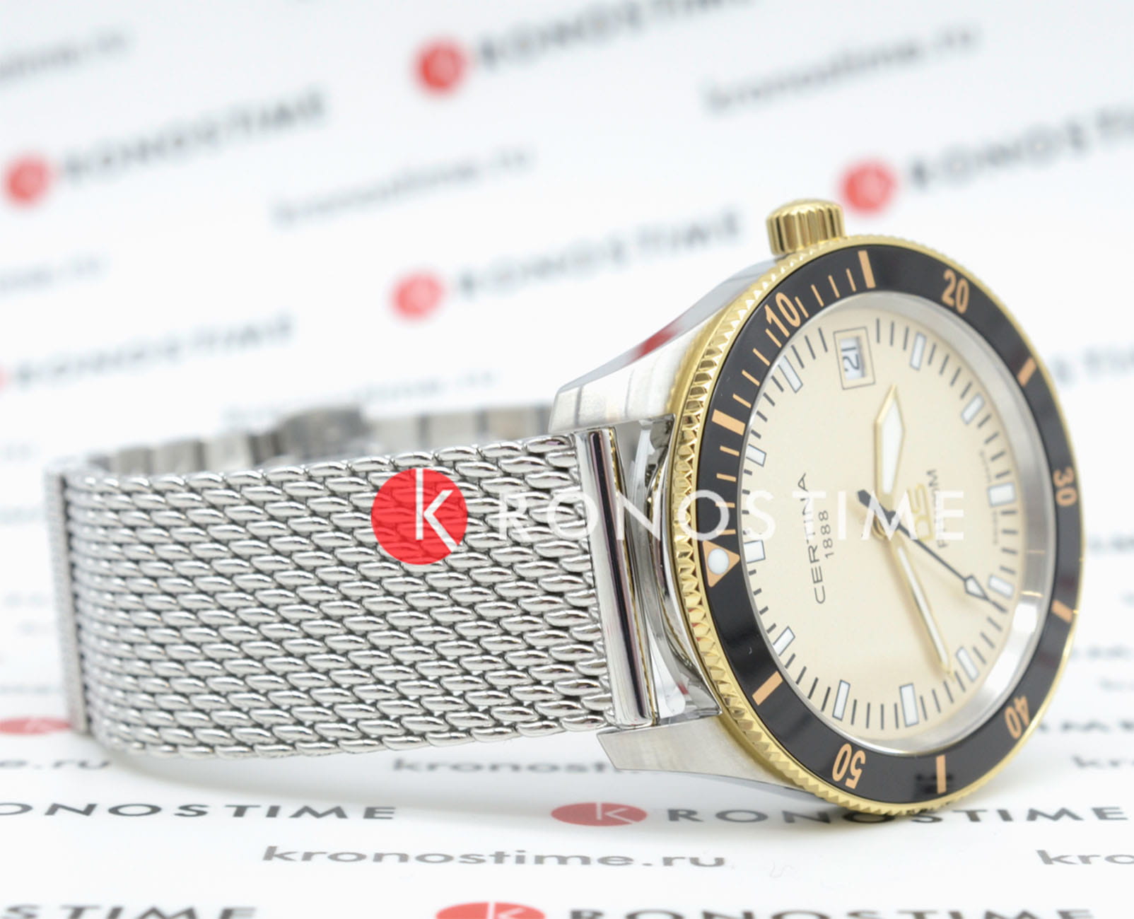 Certina DS PH100M Gent C044.410.21.030.00– часы для поклонников ярких аксессуаров. Корпус изготовлен из высококачественной нержавеющей стали 316L с . Под твердым сапфировым стекломСапфировое стеклоПрочный и надёжный материал из кристалла сапфира синтетического происхождения, характеризующийся особой твёрдостью и устойчивостью к царапинам и повреждениям. с антибликовым покрытиемАнтибликовое покрытиеСлой оксида металла в 0,13-0,3 микрон, благодаря которому стекло часов не бликует и не отражает свет. Антибликовое покрытие уменьшает отражение света в 10 раз, обеспечивая отличную читаемость показателей циферблата. находится бежевый циферблат на котором вы найдете окошко даты в положении 3 часа, а также маркировку, покрытую люминесцентным покрытиемЛюминесцентное покрытиеПозволяет считывать показания времени в темноте. Производители наносят на стрелки, часовые индексы, безель или поверхность циферблата светонакопительный состав, дающий холодное свечение. Super-LumiNova. Класс водозащиты: 100 метров, позволит плавать, нырять и заниматься другими водными видами спорта. Стальной ремешок миланского плетения на застёжке-бабочке с кнопкамиЗастёжка "бабочка"Такой вид застёжки дополняется предохранителями, помогающими избежать случайного раскрытия браслета. Обладают изящным исполнением. . БезельБезельВнешний ободок, закрепляющий стекло. В спортивных часах так называется поворотное кольцо с делениями на циферблате, выполняет роль таймера – замеряет отрезки времени на шкале. Неподвижный безель – элемент декора. Однонаправленно вращающийся безель на дайверских часах позволяет фиксировать моменты погружения и выныривания на поверхность. из нержавеющей стали с PVD-покрытиемPVDУльтратонкое покрытие наносится в технике вакуумного напыления, сочетает в себе нитрид титана особой прочности со слоем золота или оксида хрома. Несёт в себе декоративную или защитную функцию.