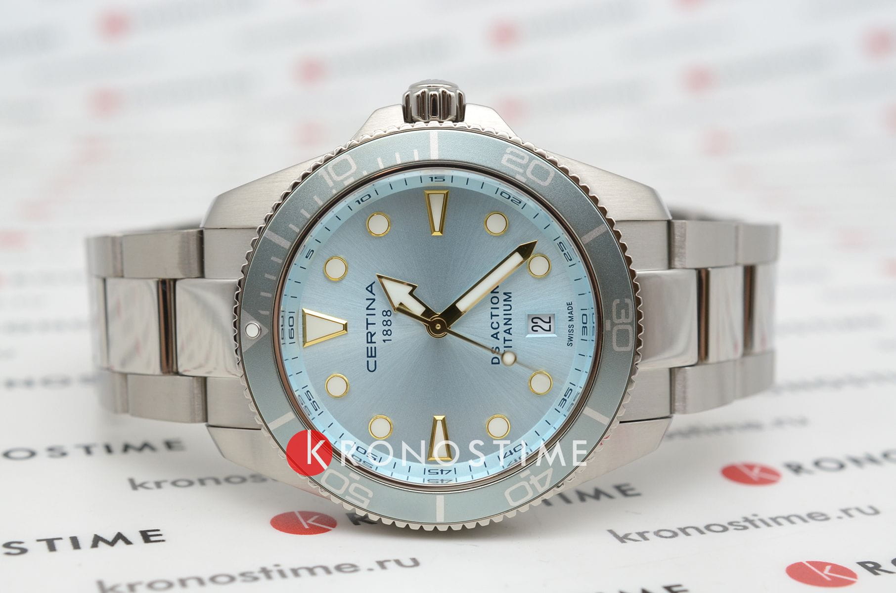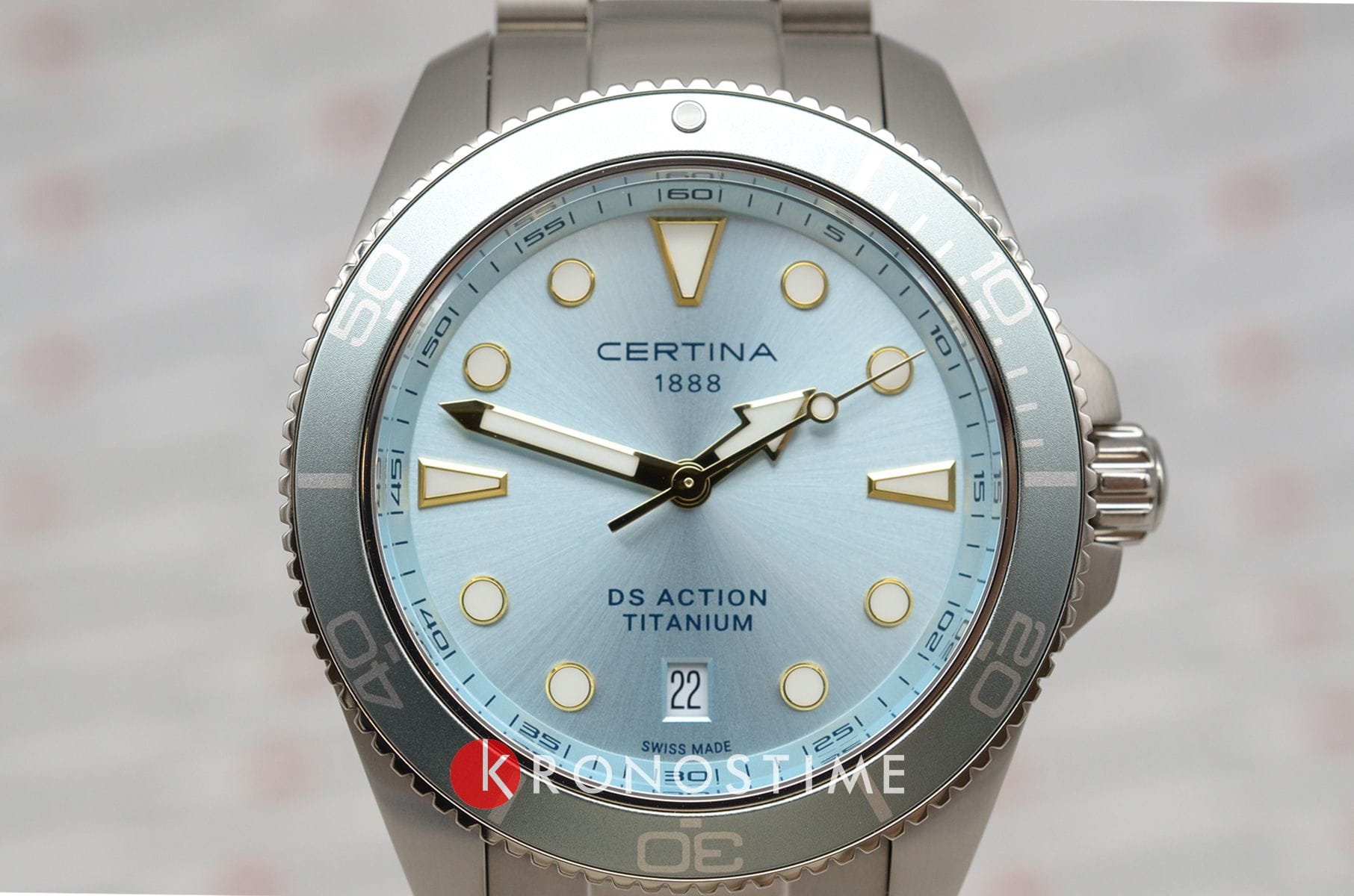 Certina DS Action C048.410.44.351.00 – элегантные мужские часы, сочетающие современный дизайн и высокую функциональность. Корпус диаметром 40 мм выполнен из титана, что обеспечивает лёгкость, прочность и гипоаллергенные свойства. Светло-голубой циферблат с метками и стрелками, покрытыми люминесцентным покрытиемЛюминесцентное покрытиеПозволяет считывать показания времени в темноте. Производители наносят на стрелки, часовые индексы, безель или поверхность циферблата светонакопительный состав, дающий холодное свечение., обеспечивает отличную читаемость в любых условиях, а его поверхность защищена сапфировым стекломСапфировое стеклоПрочный и надёжный материал из кристалла сапфира синтетического происхождения, характеризующийся особой твёрдостью и устойчивостью к царапинам и повреждениям. с антибликовым покрытиемАнтибликовое покрытиеСлой оксида металла в 0,13-0,3 микрон, благодаря которому стекло часов не бликует и не отражает свет. Антибликовое покрытие уменьшает отражение света в 10 раз, обеспечивая отличную читаемость показателей циферблата., устойчивым к царапинам.БезельБезельВнешний ободок, закрепляющий стекло. В спортивных часах так называется поворотное кольцо с делениями на циферблате, выполняет роль таймера – замеряет отрезки времени на шкале. Неподвижный безель – элемент декора. Однонаправленно вращающийся безель на дайверских часах позволяет фиксировать моменты погружения и выныривания на поверхность. с PVD-покрытиемPVDУльтратонкое покрытие наносится в технике вакуумного напыления, сочетает в себе нитрид титана особой прочности со слоем золота или оксида хрома. Несёт в себе декоративную или защитную функцию.. Часы оснащены швейцарским кварцевым механизмом ETA F06.412 с технологией Precidrive™Precidrive™Инновационный кварцевый механизм Certina. Часы, оснащённые этим швейцарским калибром, приравниваются к точности к сертифицированным хронометрам, точность хода составляет +/-10 секунд в год., обеспечивающей исключительную точность хода. Функция EOLEOLПредставляет собой систему, уведомляющую владельца часов о необходимости замены элемента питания. За 2 недели до полного разряда батарейки секундная стрелка перестаёт ходить чётко и начинает перепрыгивать на 3-4 деления. (индикатор окончания заряда батареи) предупреждает о необходимости замены элемента питания. Браслет из титана оснащён системой быстрой замены, позволяющей легко адаптировать стиль часов. Водонепроницаемость 300 метров (30 бар) делает модель идеальным выбором для плавания и дайвинга.