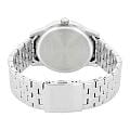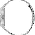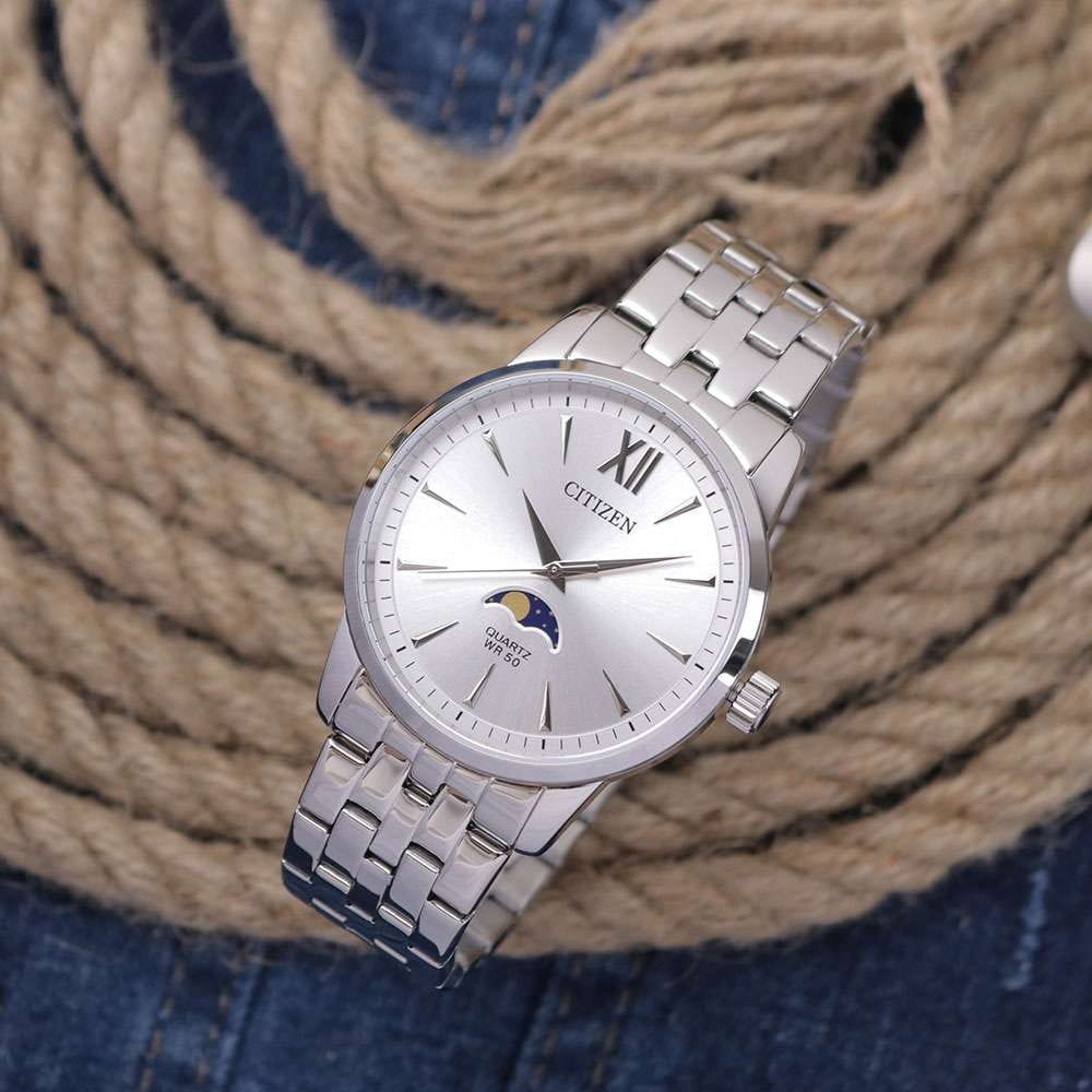 Часы Citizen AK5000-54A произведены в Японии и оснащены надёжным кварцевым механизмом калибра Citizen 6324. Корпус выполнен из нержавеющей стали и имеет классическую круглую форму диаметром 42 мм. Минеральное стеклоМинеральное стеклоМинеральное стекло представляет собой искусственно выращенный минерал кварца. Такое стекло отличается особой устойчивостью к повреждениям и царапинам. Уступает по некоторым качествам сапфировому стеклу. защищает серебристый циферблат, украшенный эффектом солнечных лучей по технологии Sunray. На циферблате расположены клиновидные стрелки в стиле Dauphine, метки в виде штрихов и римская цифра в положении 12 часов, а также индикатор фазы Луны — одно из самых востребованных усложнений в часовой классике. Часы защищены от воды по стандарту 50WR, что позволяет не бояться случайных брызг и дождя. Заводная головка отличается рифлёной поверхностью для удобства использования. Стальной браслет с раскладной застёжкойРаскладная застёжкаТакой тип застёжки используется только на браслетах из металла. Она никогда не раскрывается полностью, происходит разделение на 2 и более частей. Раскладывающая застёжка снизит вероятность потери часов к минимуму. обеспечивает комфорт и надежную фиксацию на руке. В качестве элемента питания используется батарейка SR621SW, обеспечивающая автономную работу до двух лет.
